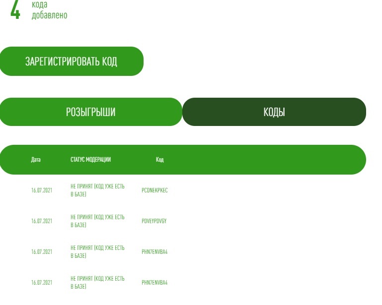 Я решил проверить первое предположение и создал второй аккаунт, где попробовал регнуть те же самые коды, получилось вот что: