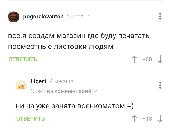 artur16 Актуальные шуточки 2 года назад #comment_253352911 Военкомат Похороны Черный юмор Комментарии Скриншот Комментарии на Пикабу Ещё 0