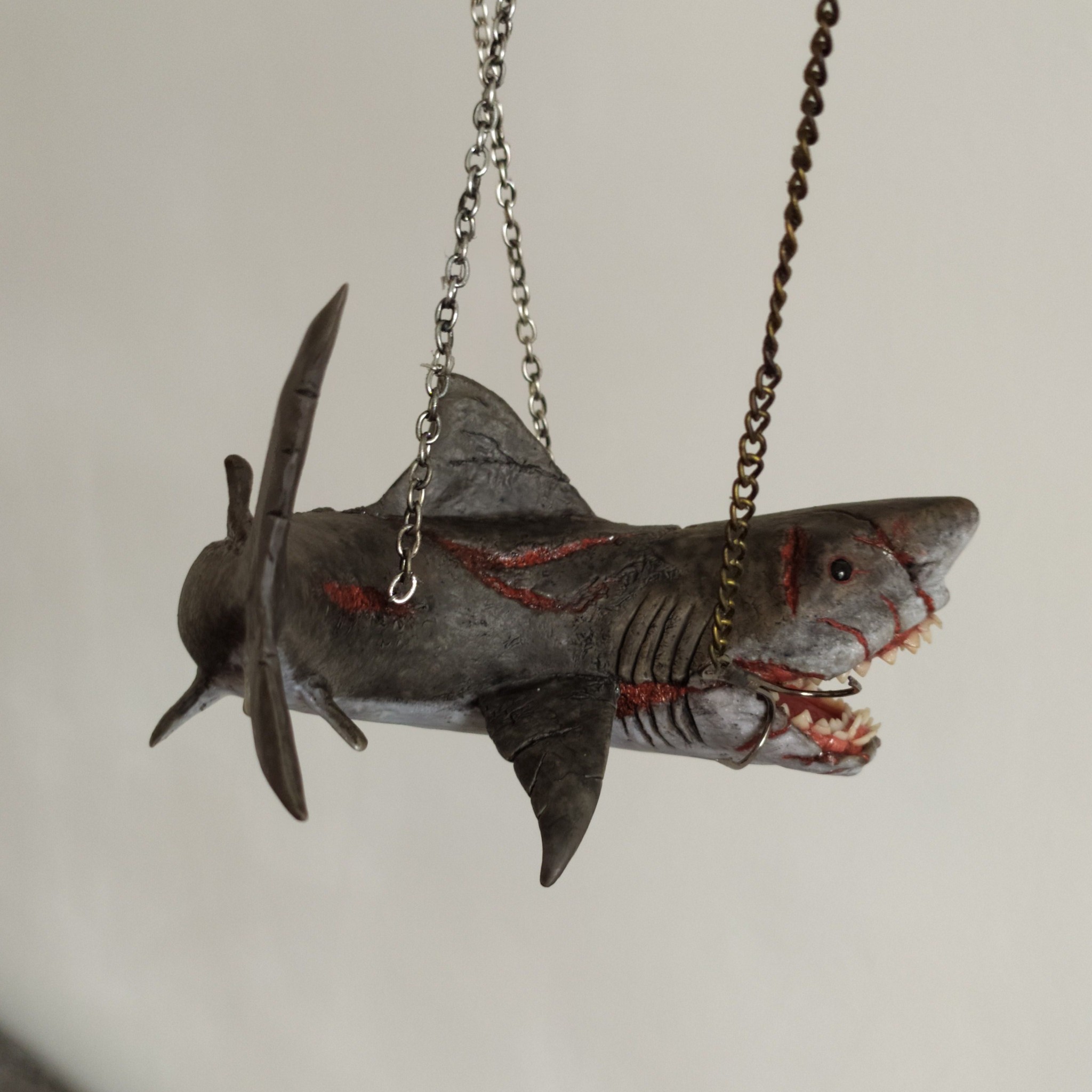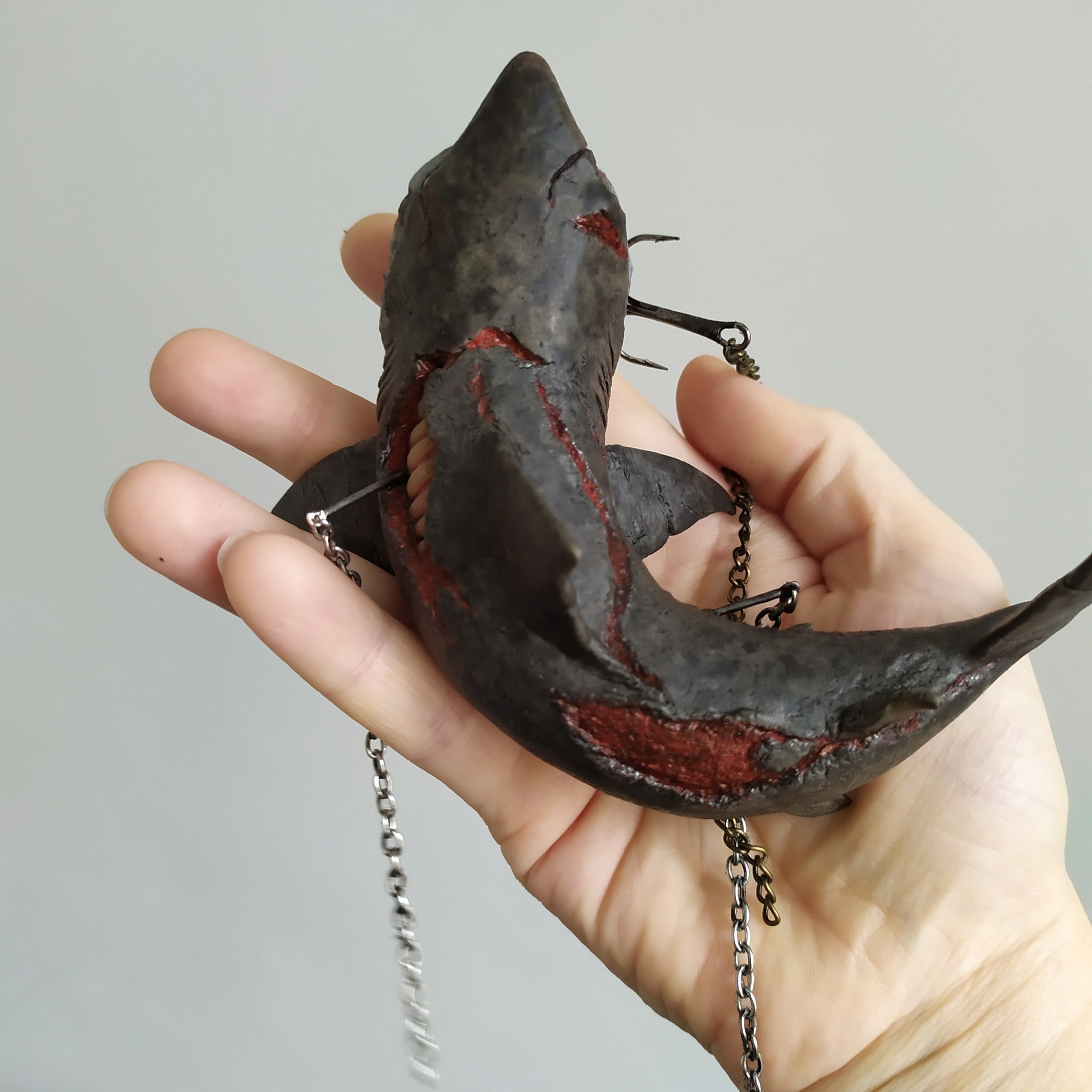 Акула слеплена из цветной, запекаемой полимерной глины. Гарпуны, якорь (тройной крючек), цепи - металл. Тонировка сухой пастелью.Точечная лакировка.