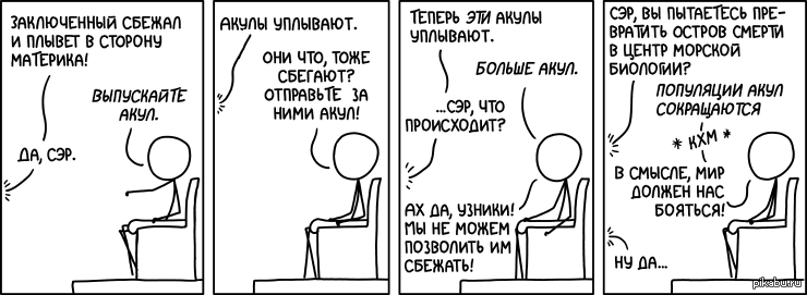 librarian Акулы 11 лет назад — А сейчас, миньоны, я направляюсь на осмотр наших клеток для акул. — Их действительно нужно осматривать так часто? — ЗАКЛЮЧЕННЫЕ НИКОГДА НЕ ДОЛЖНЫ СБЕГАТЬ. [моё] XKCD Xkcdru
