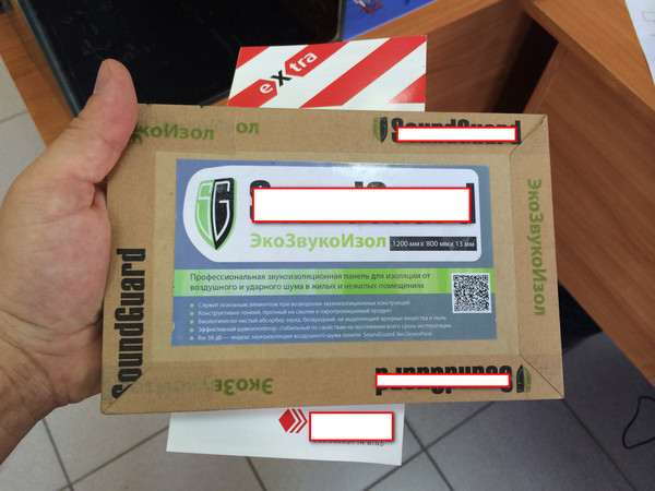 И уже практически договорились монтировать это, если бы не очередной визит к специалистам в ставший уже родным акустический магазин. В этот раз там были не только спецы, но и директор. Он заинтересовался нашими разговорами и поинтересовался у своих, а почему мне не предложили... Стоп, я обещал не делать рекламу и не называть конкретные марки, поэтому на фото внизу название замазано. В общем, материал новый, не широко распространенный, но крайне эффективный. На сегодняшний день, пожалуй, самый эффективный в сфере шумоизоляции. По сути это листы картона, внутри которого располагаются ячейки-соты, засыпанные мельчайшим песком.