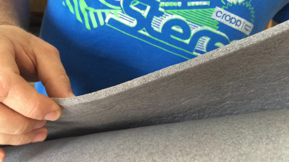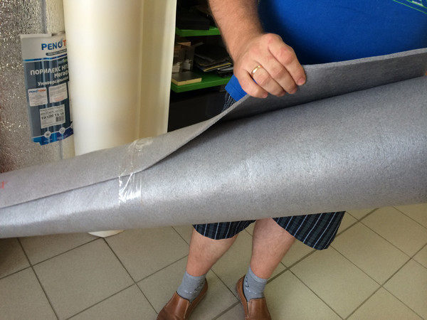 После долгого обсуждения решили зазвукоизолировать также и пол. Изначально делать на нем шумку не хотели — не хотелось городить каркас, уменьшая кубатуру квартиры. Но нам предложили бескаркасный вариант — с помощью пенотерма. Это сантиметровой толщины материал, обладающий отличием от поролона и прочих тем, что под тяжестью пола и и предметов сжимается всего на 10%, при этом сохраняя свои шумоизоляционные свойства. А простой поролон сожмется и все.