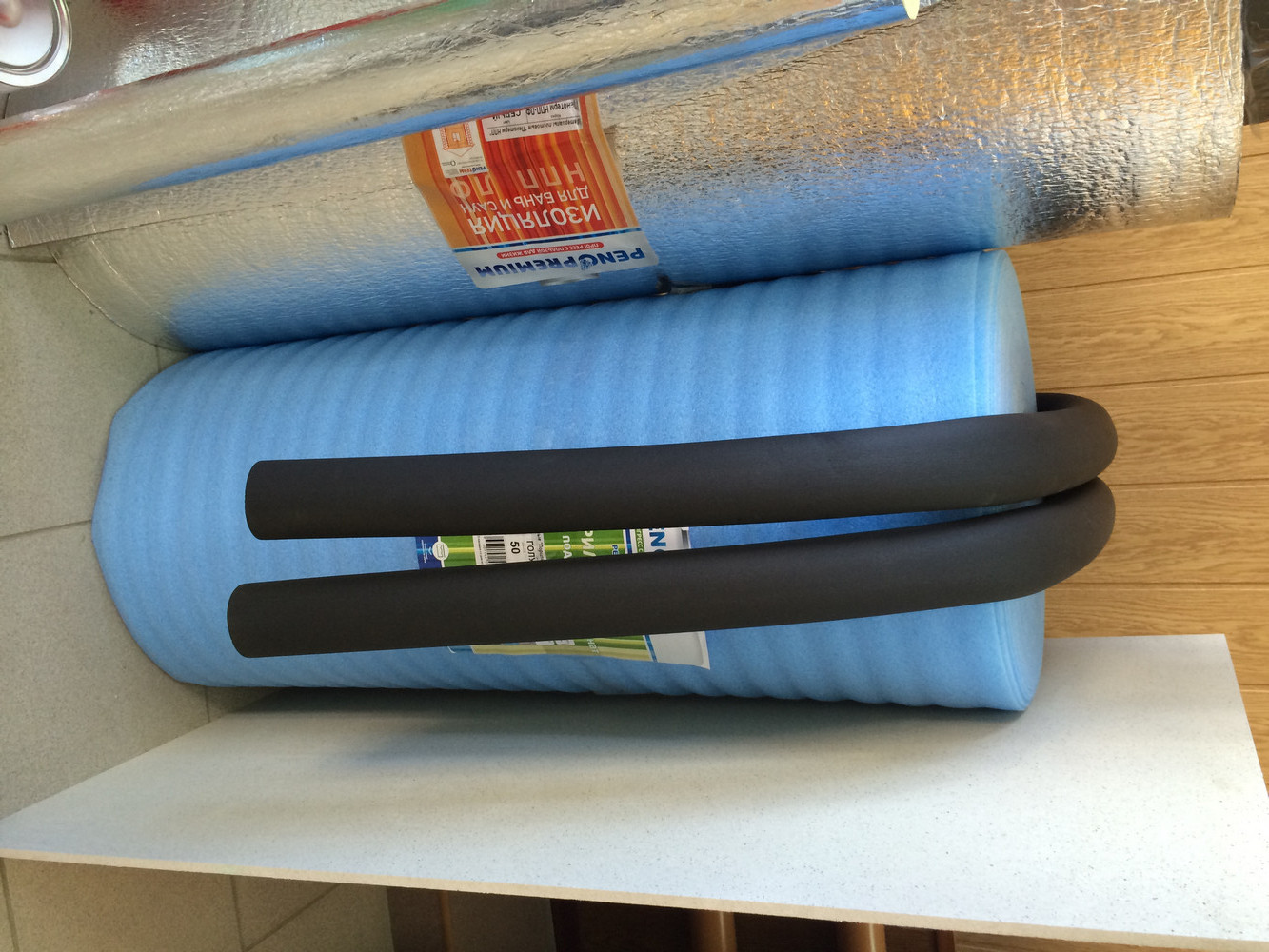 Попутно решил сфоткать материал для изоляции труб (его множество, на фото лишь малая часть) — обматываем трубу специальной пленкой (верхнее фото) и упаковываем в полипропилен (нижнее фото) или вспененный каучук. Стоит копейки.