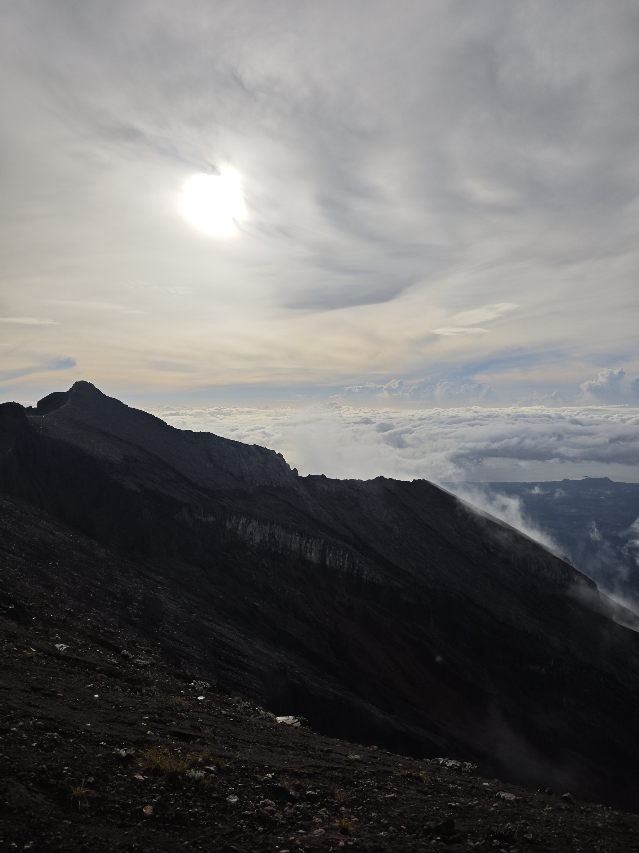 Гид спрашивает, хотим ли мы пойти на первую вершину. Мы хотим. Идём по хребту. В этот момент облако, преследовавшее нас, накрывает вершину вулкана. Видимость становится метров 20.
