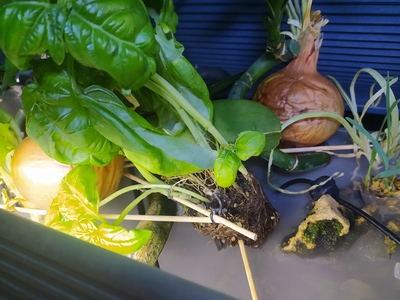 Привет. Да просто покупаешь в продуктовом базилик в горшочке, горшочек разрезаешь, аккуратно его вытаскиваешь, втыкаешь в корни деревянный шампур и ставишь на аквариум чтобы корни касались воды. Часть листьев в процессе сломаешь - их обрезаешь и в салат, приживётся он тоже не сразу и часть корней ты ему повредил поэтому некоторые листья завянут и их тоже нужно будет обрезать.