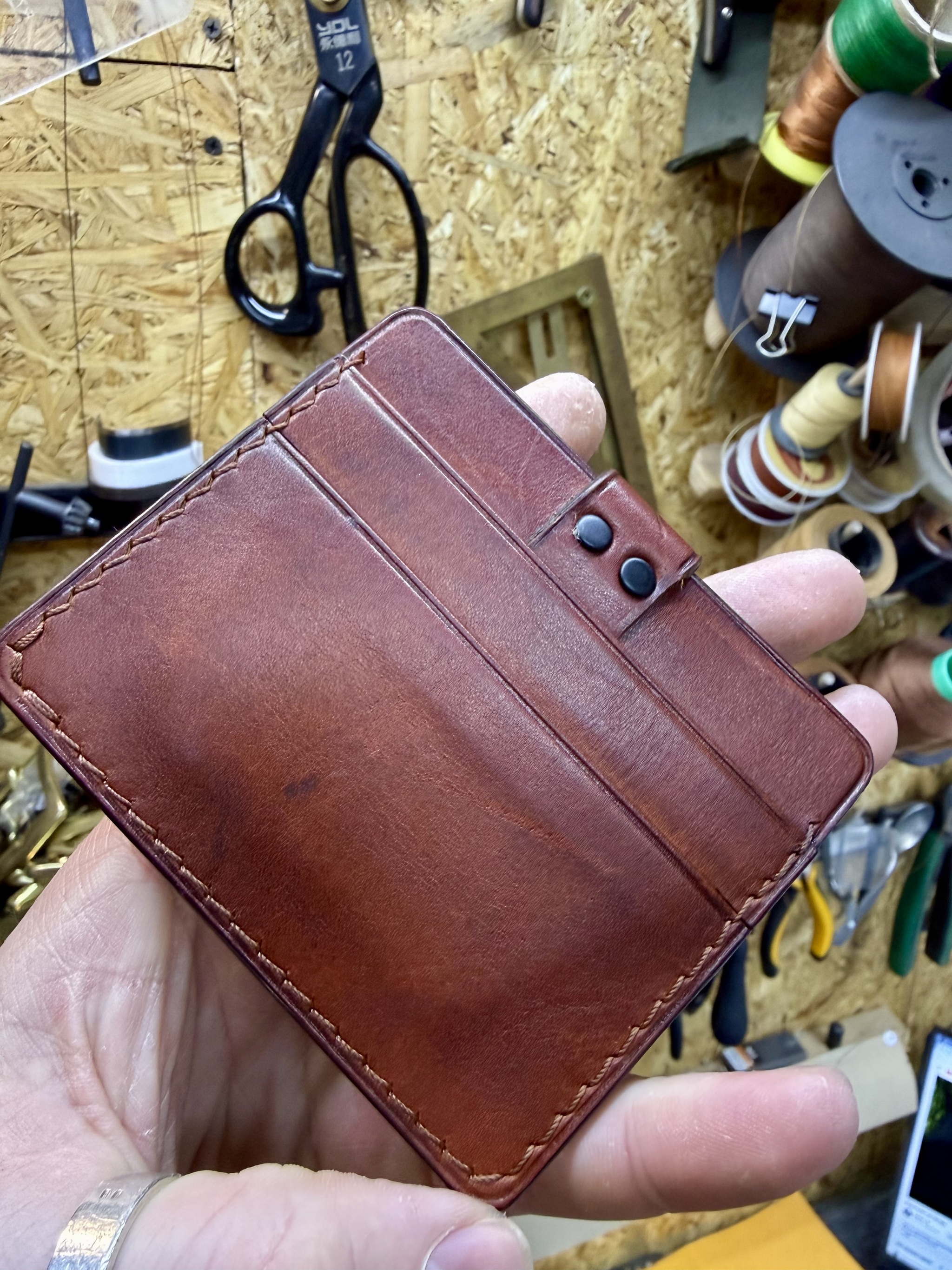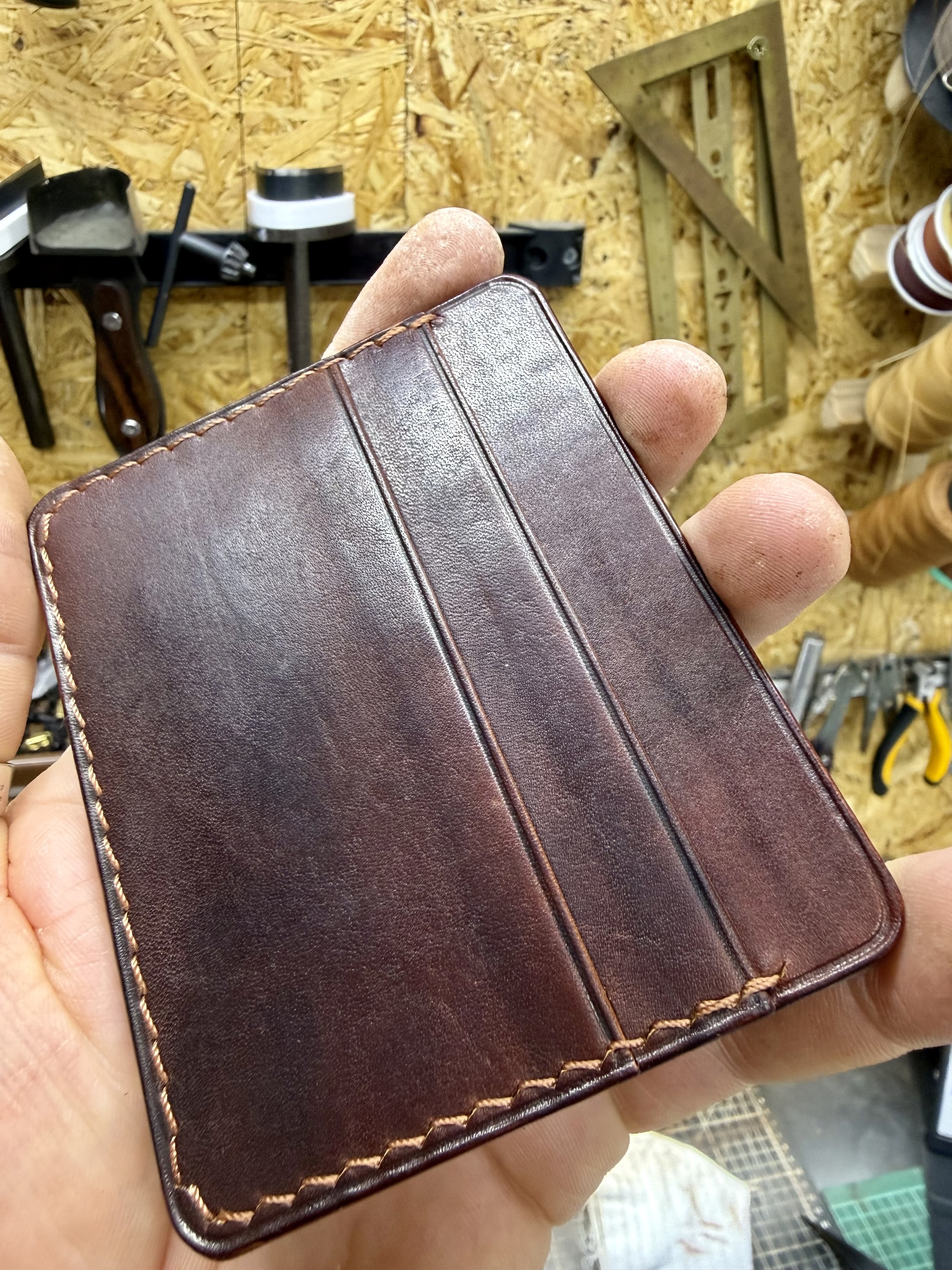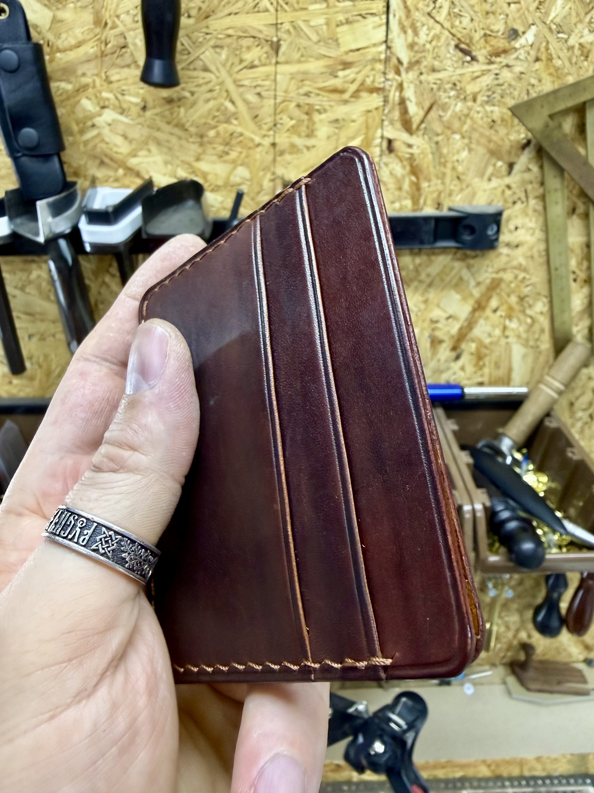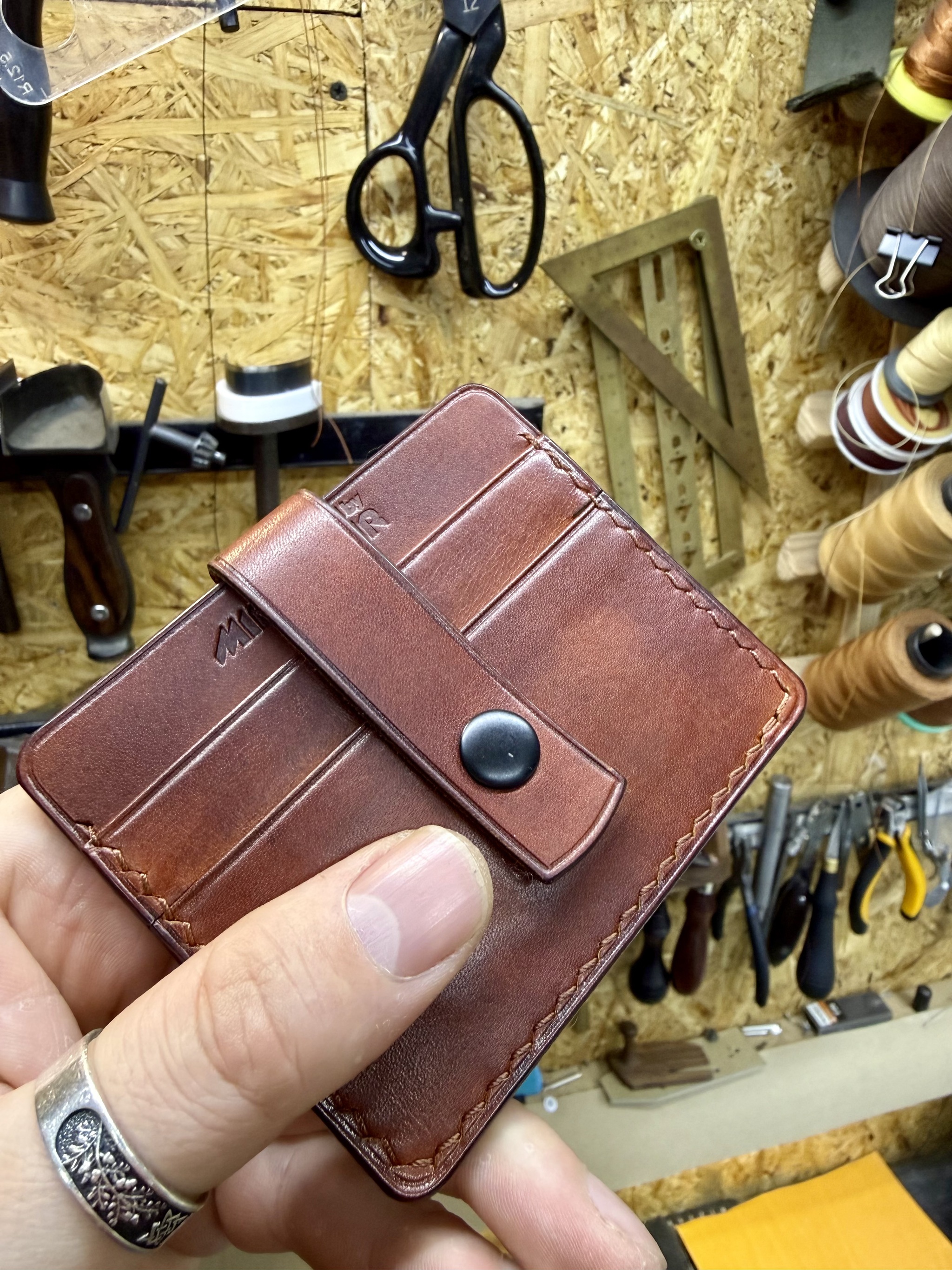 Прошу поделиться вашим мнением. Дело вот в чем. Я тут немного изменил самую популярную среди моих заказчиков модель картхолдера (маленького кошелька для карт). В общем, он теперь тоньше, с кожподкладом в основном отделе, карманы сделаны в подгибку и я убрал хлястик с кнопкой.