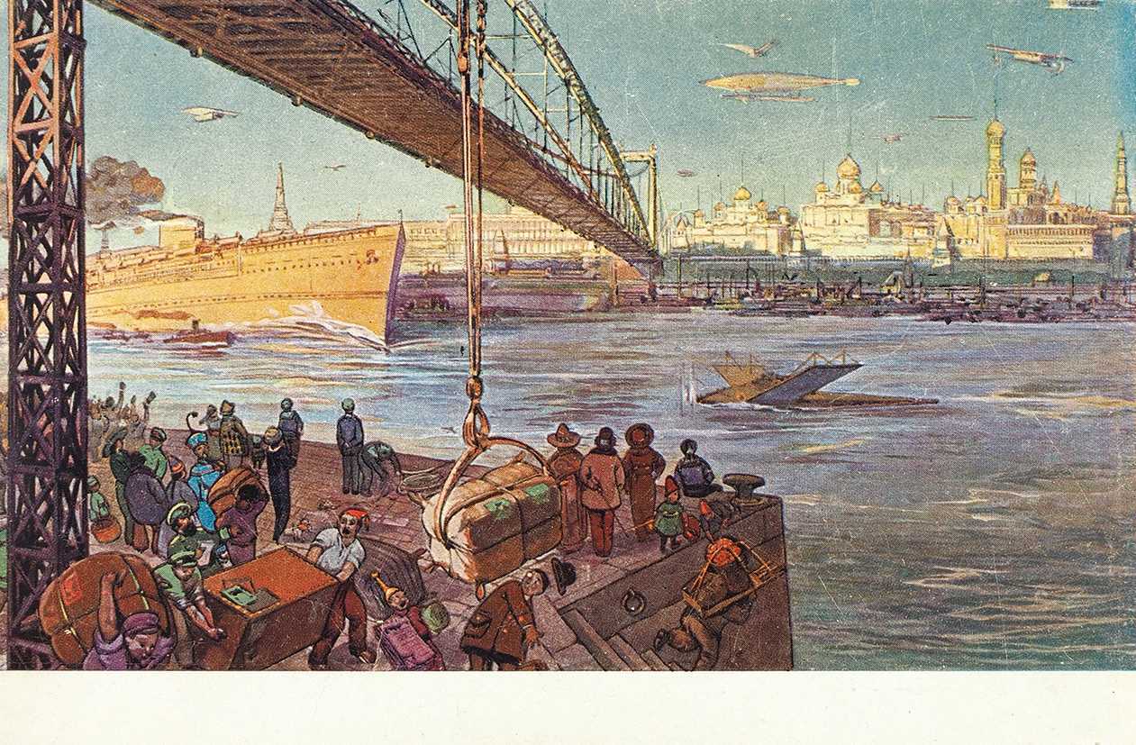 Кремль так же украшает древнюю Белокаменную и с золотыми куполами представляет феерическое зрелище. Тут же у Москворецкого моста мы видим новые огромные здания торговых предприятий, трестов, обществ, синдикатов и т. д. На фоне неба стройно скользят вагоны подвесной воздушной дороги…У пристани готов вспорхнуть лёгкий гидроплан.