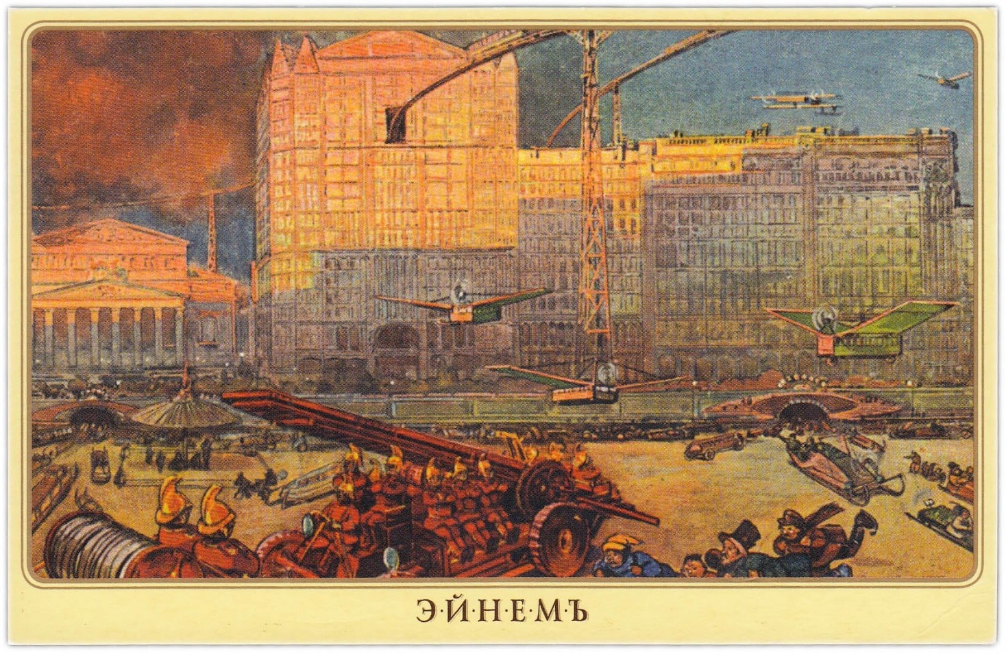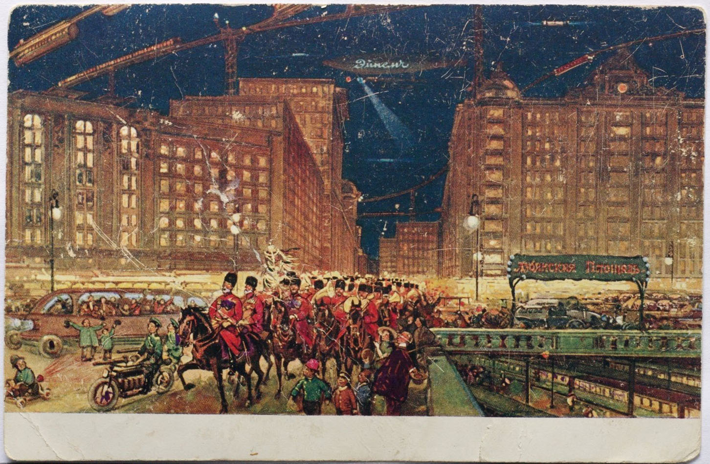 Ясный вечер. Синеву неба чертят четкие линии светящихся аэропланов, дирижаблей и вагонов воздушной дороги. Из-под мостовой площади вылетают длинные вагоны Московского метрополитена, о котором при нас, в 1914 году, только говорили. По мосту над метрополитеном мы видим стройный отряд доблестного русского войска, сохранившего свою форму еще с наших времен. В синем воздухе мы замечаем товарный дирижабль Эйнем, летающий в Тулу с запасом шоколада для розничных магазинов.