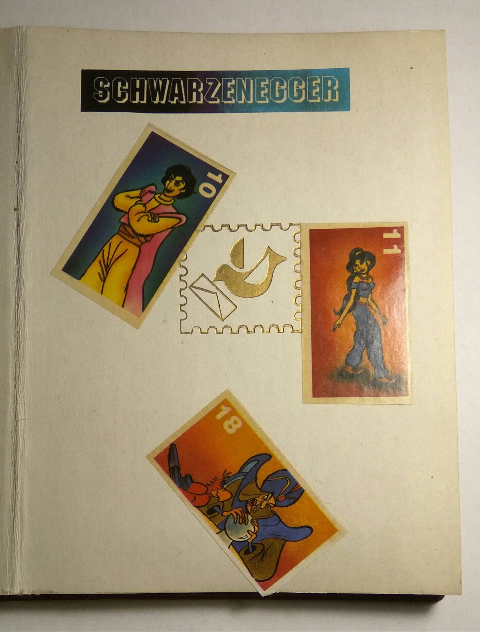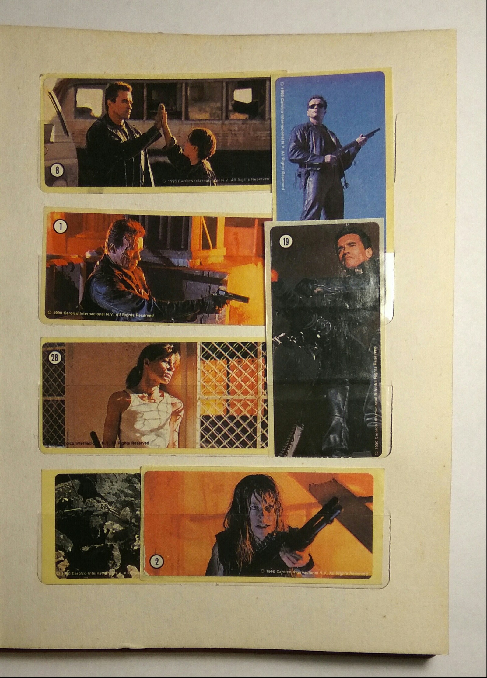 Были жвачки Алладин. Наклейка Шварценеггер из блока наклеек Т2. Раньше продавали наклейки листами.