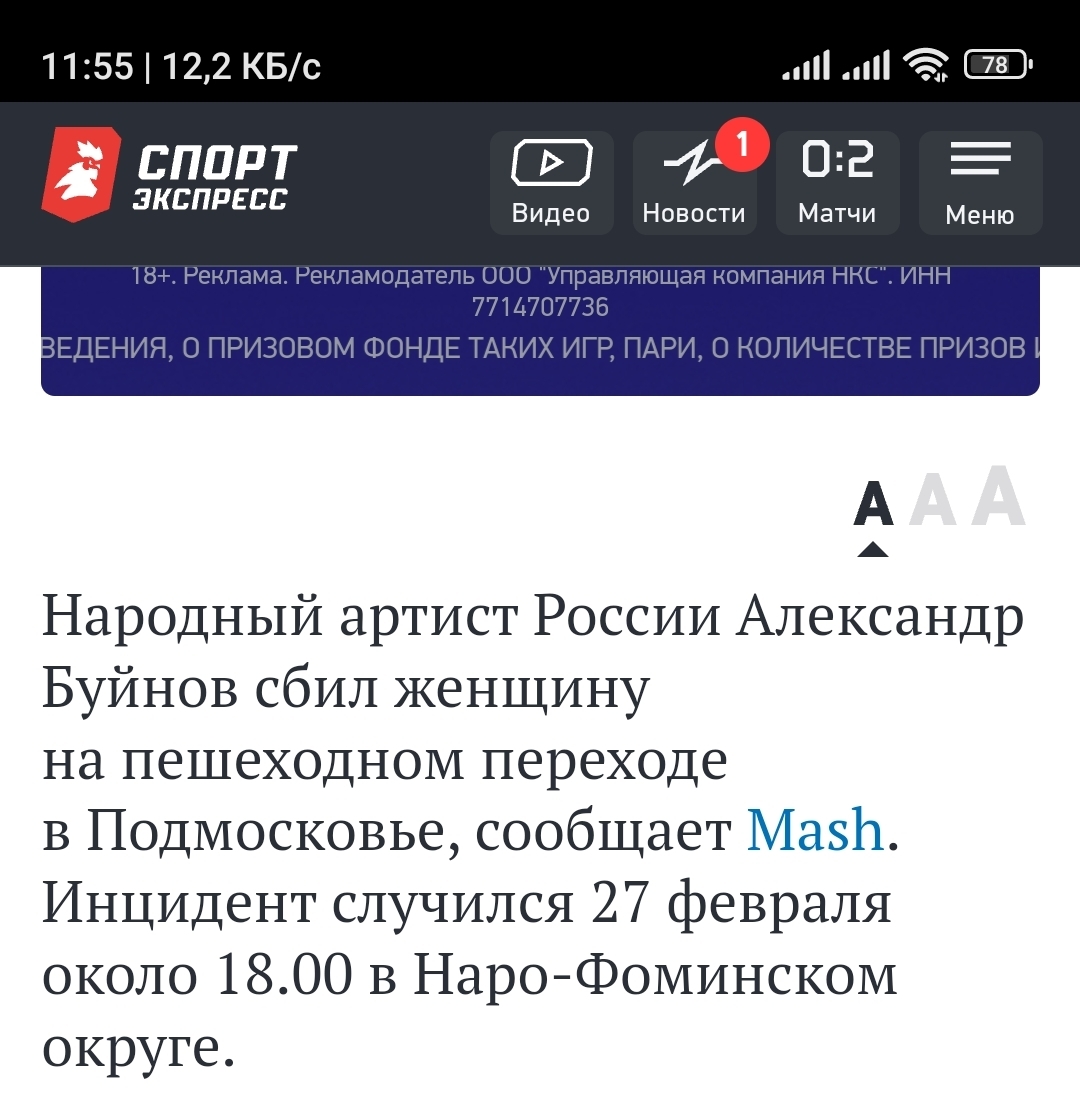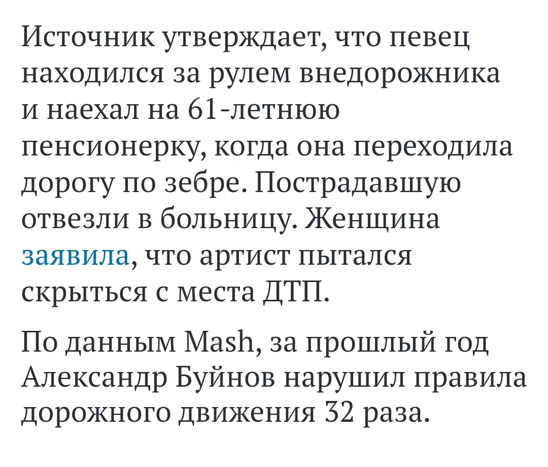 jalmez5 8 месяцев назад Баяны Александр Буйнов на Lexus сбил пенсионерку https://m.dzen.ru/news/story/3aeb1753-dd77-56db-a211-8ac5c78... На самом деле 26 февраля около 18:00, опечатка Происшествие ДТП Пешеходный переход Яндекс Дзен (ссылка) Длиннопост Александр Буйнов Скриншот 1 Ещё 0
