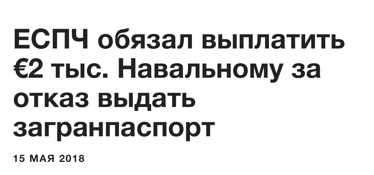 Так же ЕСПЧ признал незаконным отказ российских властей выдать загранпаспорт Алексею Навальному.