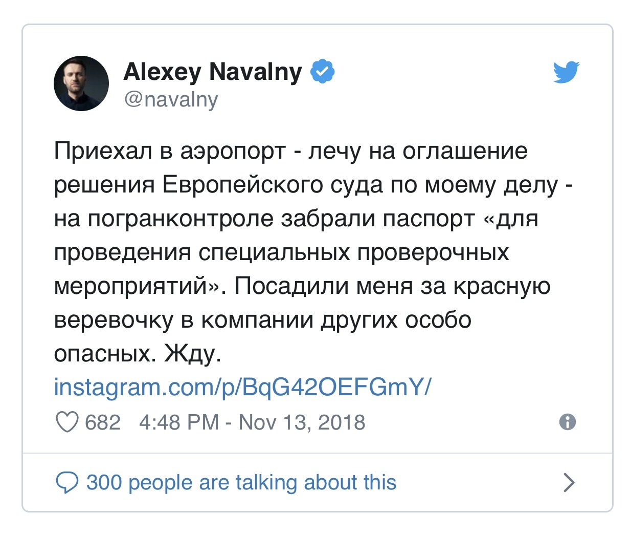 Навальный отметил, что его остановили на пограничном котроле, когда он вместе с женой Юлией и адвокатом Ольгой Михайловой планировал вылететь в Страсбург на оглашение решения по его делу Европейского суда по правам человека. Политик уточнил, что у него забрали паспорт «для проведения специальных проверочных мероприятий».