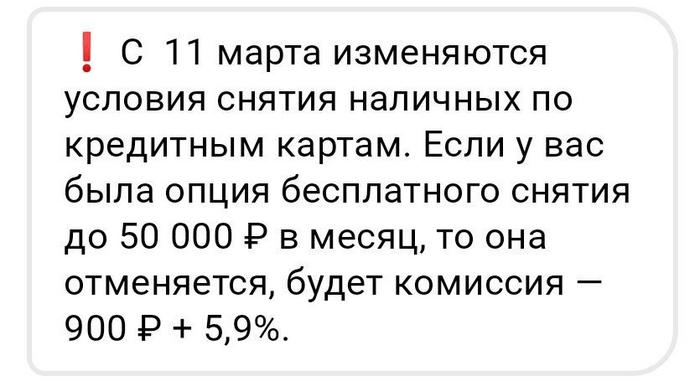 С 11.03.2022 года Альфа Банк изменил условия по снятию наличных с кредитных карт. Посмотрите в личном кабинете, так как СМС уведомлений нет. Теперь за снятие любой суммы будет взиматься комиссия 900 рублей + 5,9%.