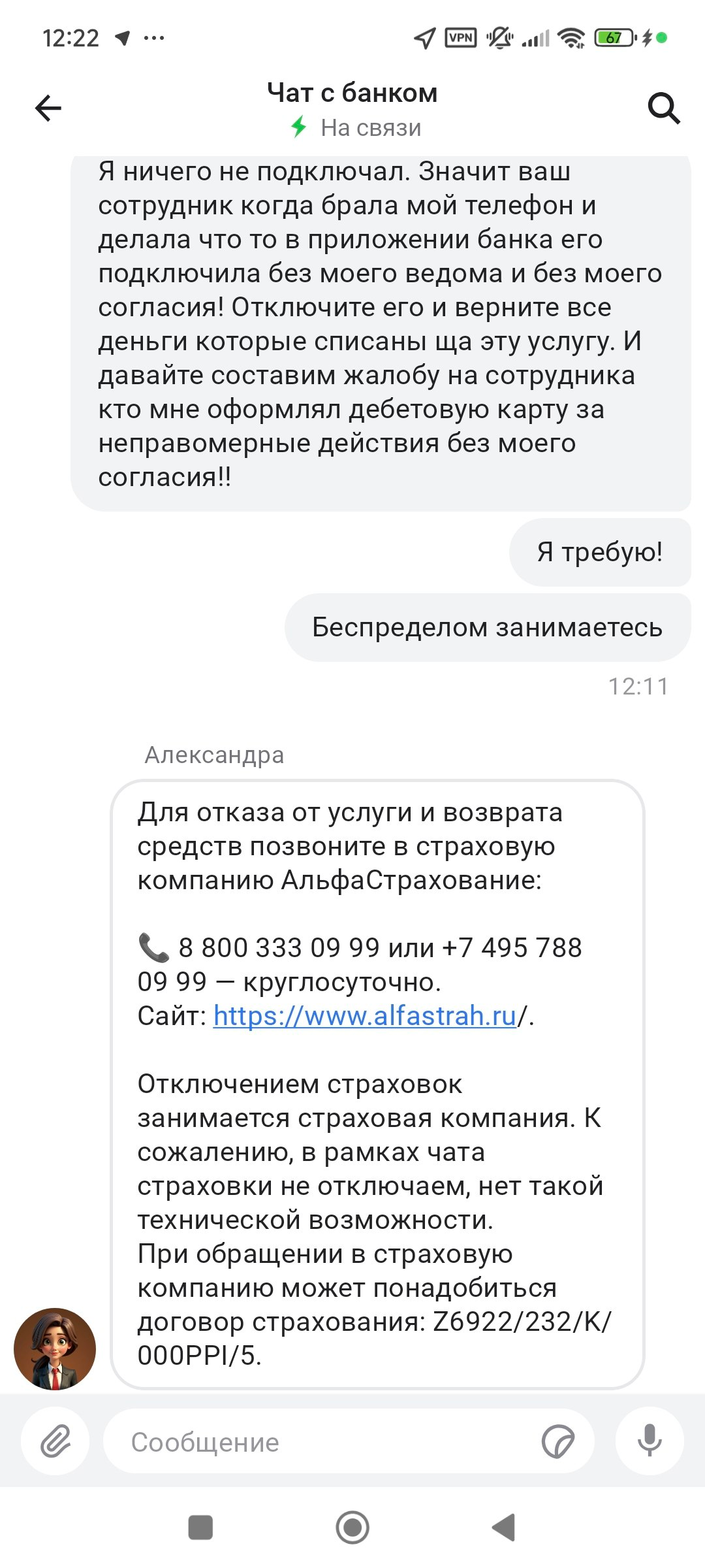Пришел за дебетовой картой. В процессе оформления карты, сотрудник который мне оформлял попросил мой телефон с открытым приложением Альфа банка, чтобы активировать карту. Это была моя фатальная ошибка, как потом выяснилось. После передачи мне телефона я еще специально уточнил, а ничего ли мне сотрудник не подключил втихую какую нибудь услугу, в ответ эта сотрудник-крыса с улыбкой ответила, что - нет, конечно.