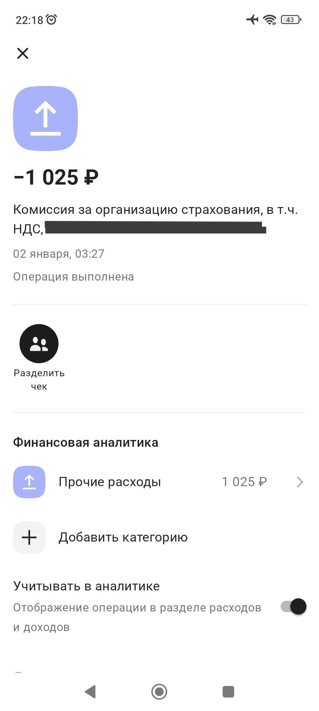 Тут 2 января случайно захожу в историю операций кредитной карты и вижу списание 1025 рублей "за организацию страхования", на которое я не давал своем согласие. Сначала подумал, что это плата на обслуживание кредитной карты, но выяснил что это разные виды комиссий.