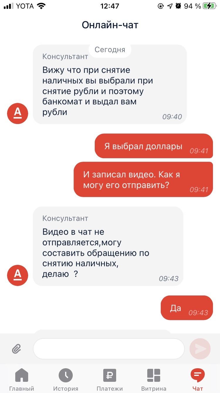 Обратился в поддержку банка, где меня настоятельно пытались убедить сначала что это я не разобрался и выбрал рубли вместо долларов, потом убеждали что я использовал банкомат, который не работает с долларами (на видео явно видно наклейку с валютами), затем настаивали на том, что по этому адресу вообще нет банкомата с долларами, а после этого утверждали, что этот банкомат работает только на прием валюты.