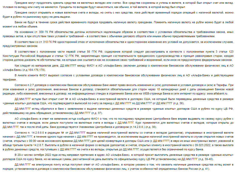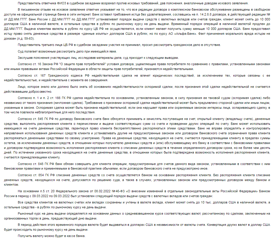 Самое важное в решении суда - условия Альфа-Банка о выплате денег по их курсу при покупке валюты в период с 9 марта по 9 сентября 2022 признаны незаконными.