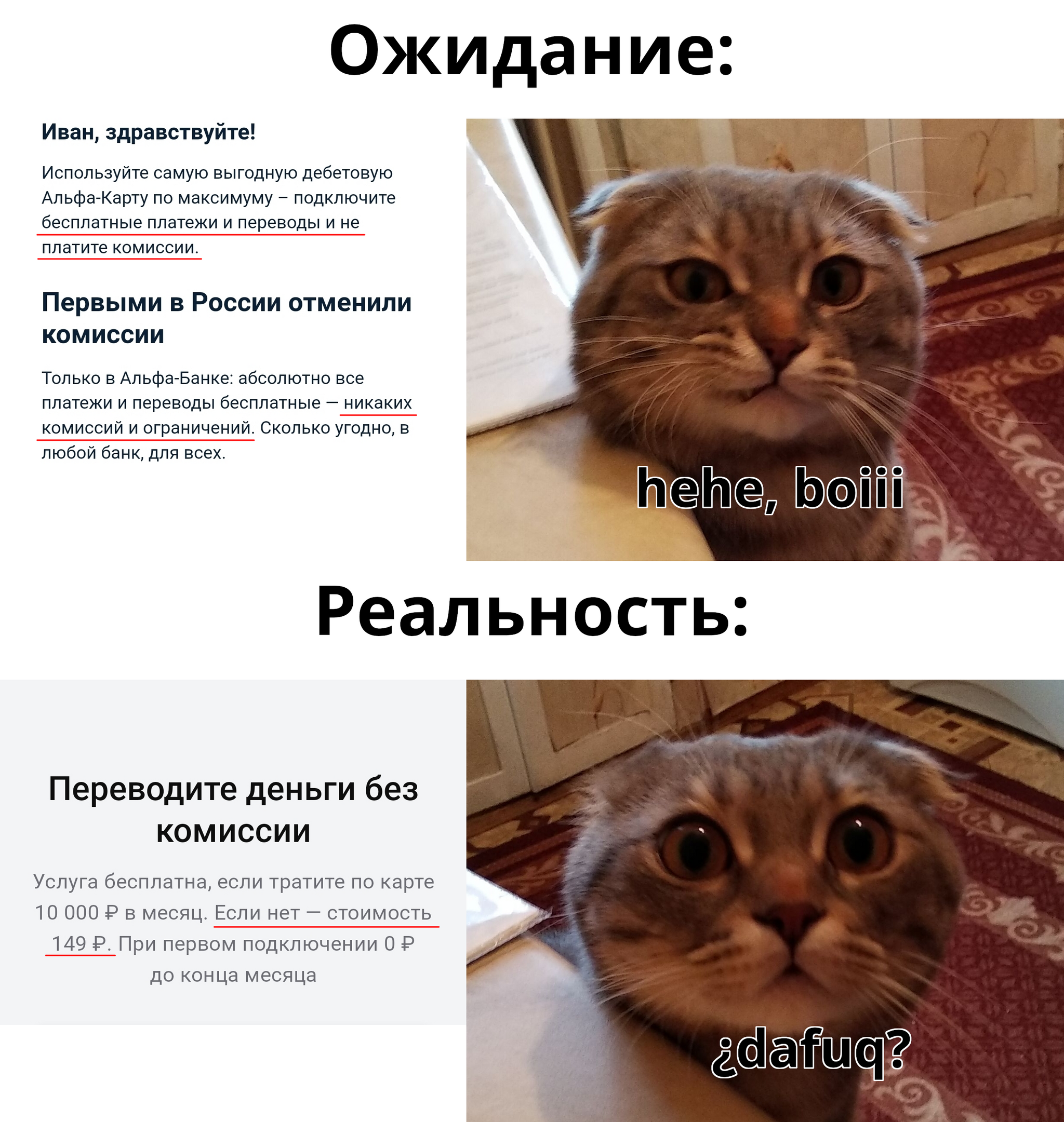 Не то, чтобы я ждал подарков от Альфочки, да и потратить в месяц меньше 10К не получится, если карта Альфы основная, просто бросилось в глаза очень странное понимание "комиссий" и "ограничений".