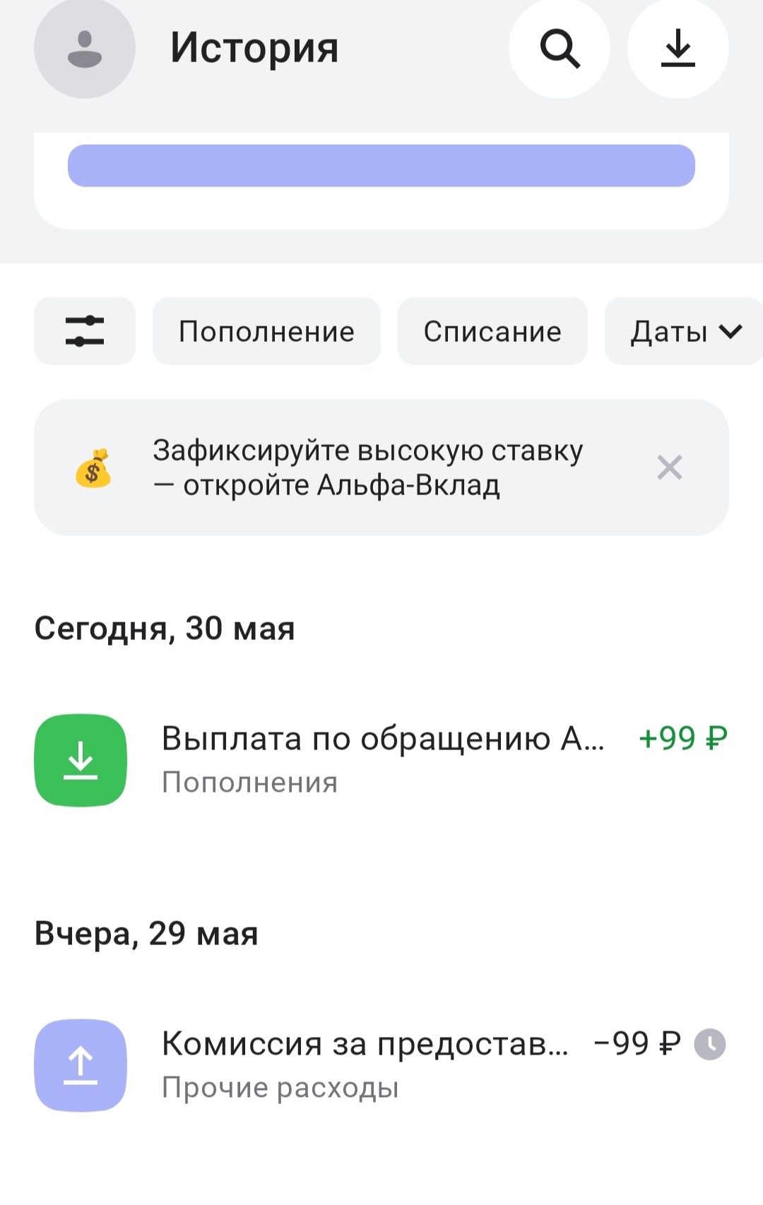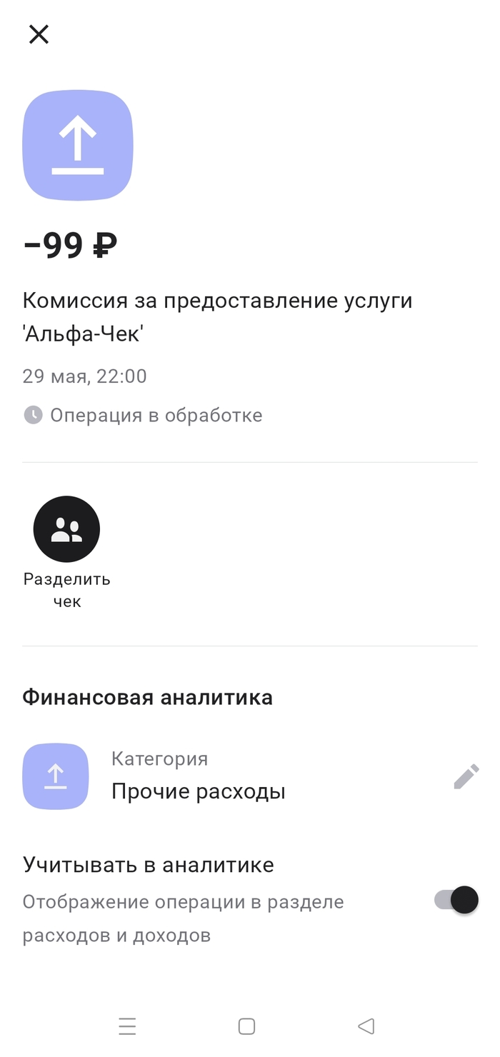 Несколько лет являюсь клиентом Альфа-Банка, но пользуюсь картой нерегулярно. Пару дней назад зашел в приложение и увидел задолженность в размере 99 рублей за услугу информирования о балансе.