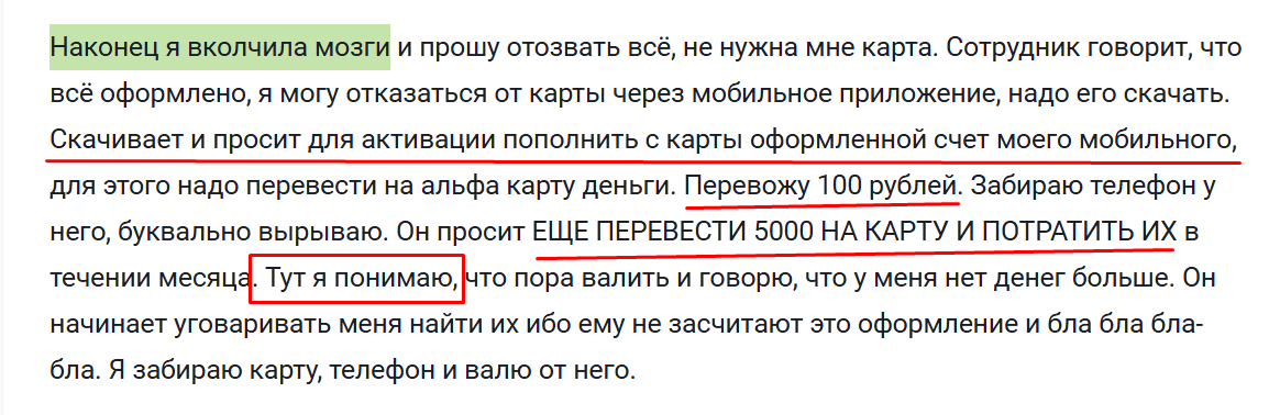 Наконец я вколчила мозги и прошу отозвать всё, не нужна мне карта. Сотрудник говорит, что всё оформлено, я могу отказаться от карты через мобильное приложение, надо его скачать. Скачивает и просит для активации пополнить с карты оформленной счет моего мобильного, для этого надо перевести на альфа карту деньги. Перевожу 100 рублей. Забираю телефон у него, буквально вырываю. Он просит ЕЩЕ ПЕРЕВЕСТИ 5000 НА КАРТУ И ПОТРАТИТЬ ИХ в течении месяца. Тут я понимаю, что пора валить и говорю, что у меня нет денег больше. Он начинает уговаривать меня найти их ибо ему не засчитают это оформление и бла бла бла-бла. Я забираю карту, телефон и валю от него.