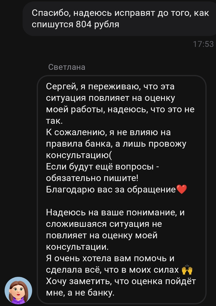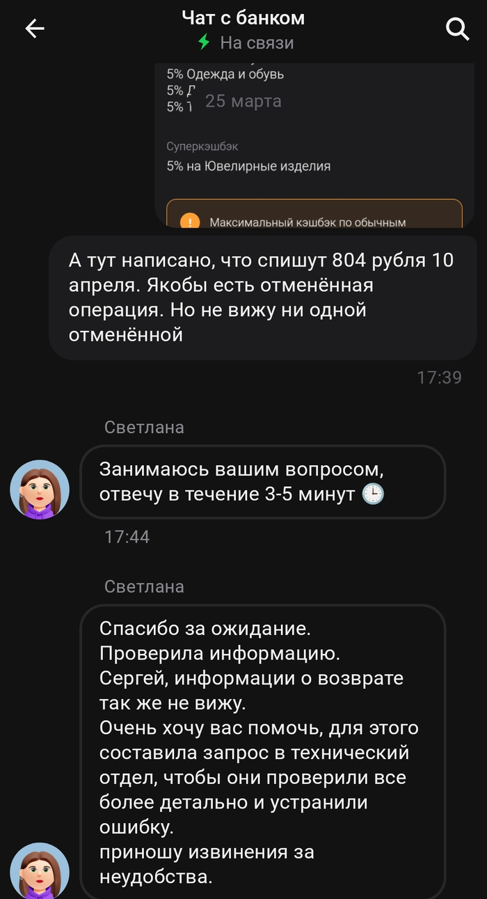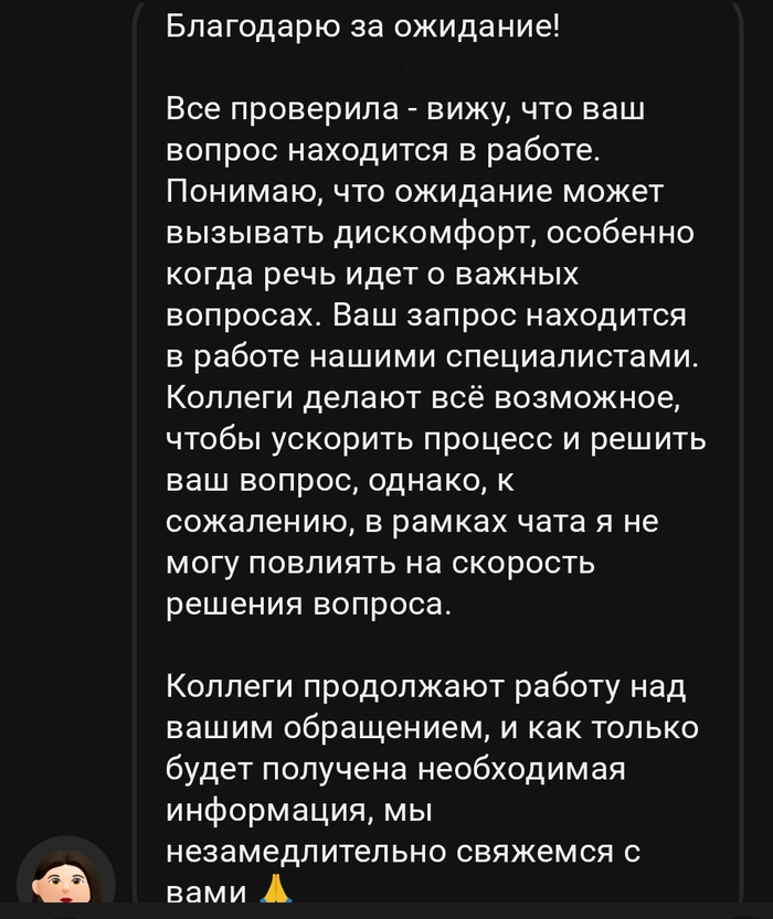 Проходит время... Еще время... Никто не пишет, переживаю, что до 10 числа не будет решения и у меня спишут эти денежные средства. Пишу сам.