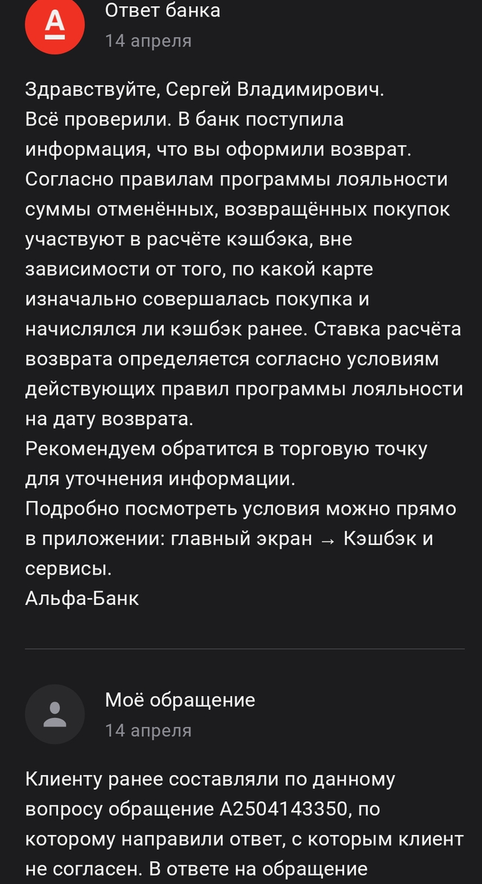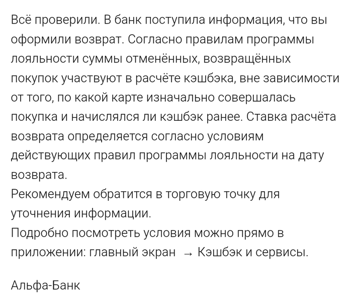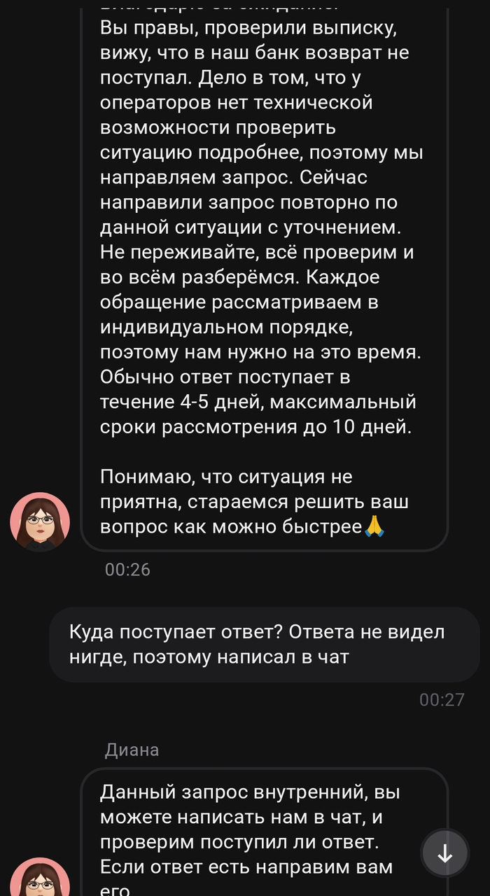 И, о чудо - возврата она так же не видит. Тоже нужно запомнить. А еще оказывается им в чат надо писать, чтобы узнать статус обращения - ну клиентоориентированность на уровне Альфа-Бутылки
