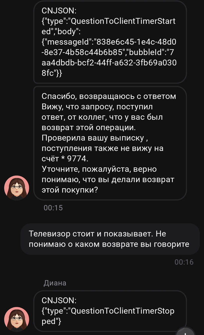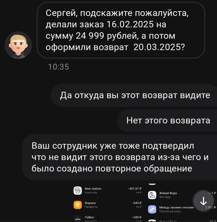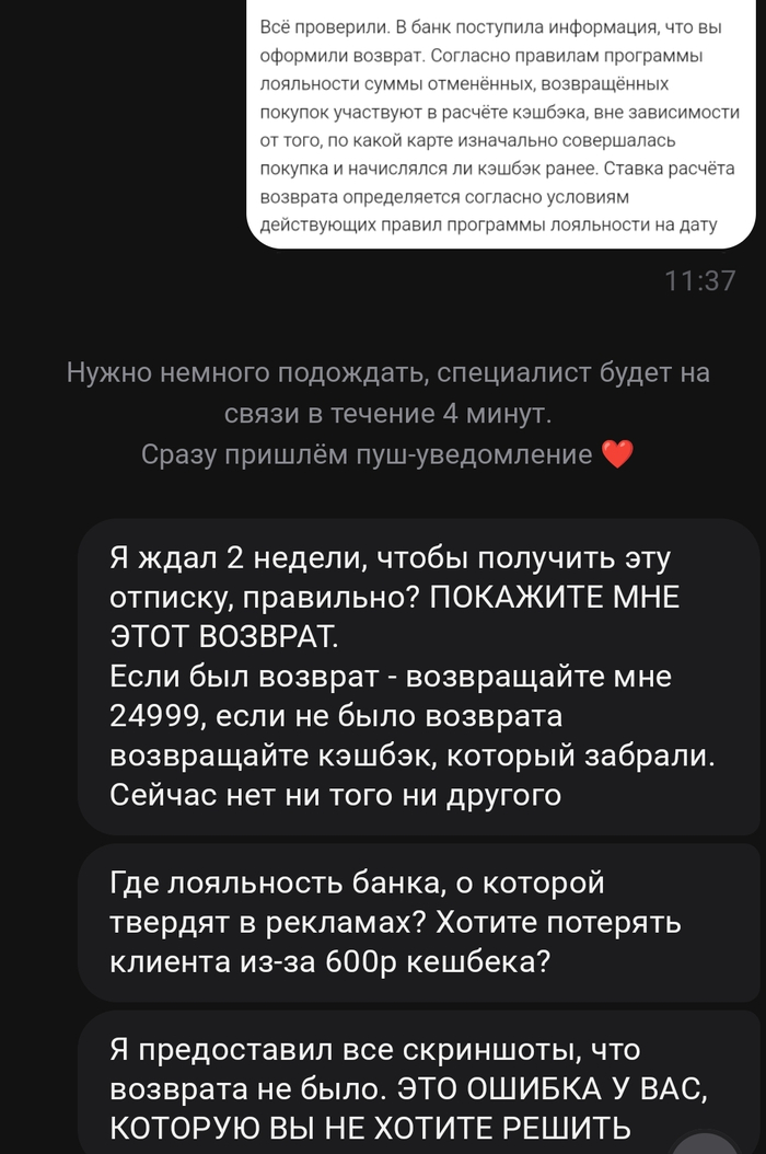 Дальше я пытаюсь получить от них хоть одно доказательство возврата, скриншот, хоть что-то, но безуспешно. Возврат был, но никто его не видел.