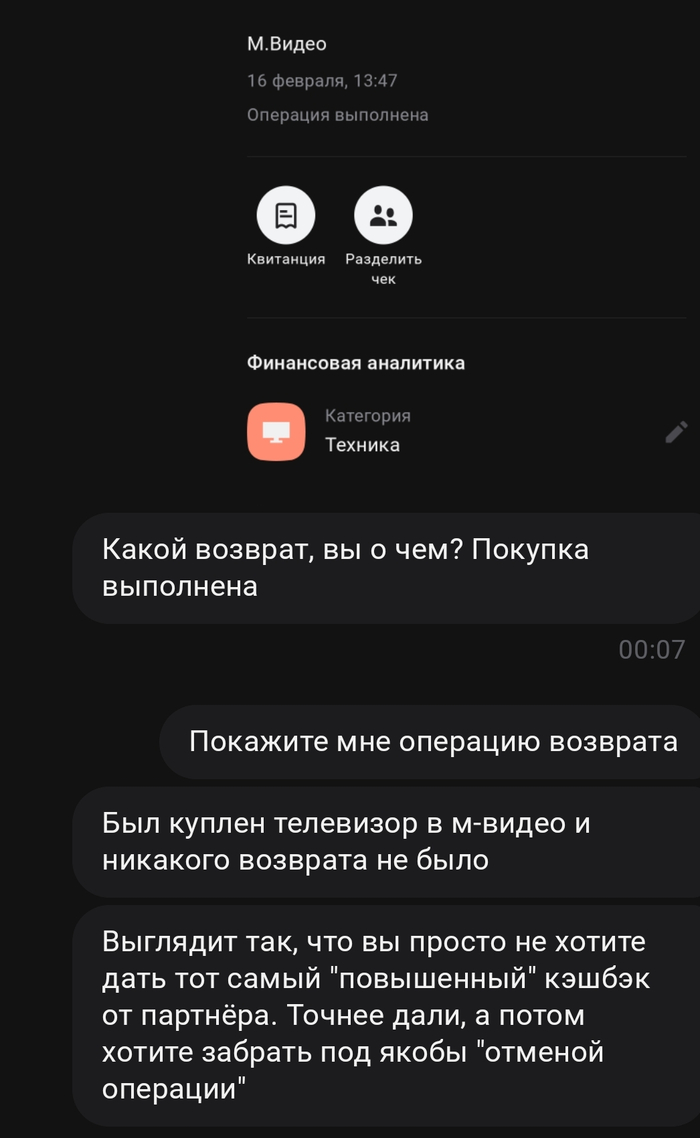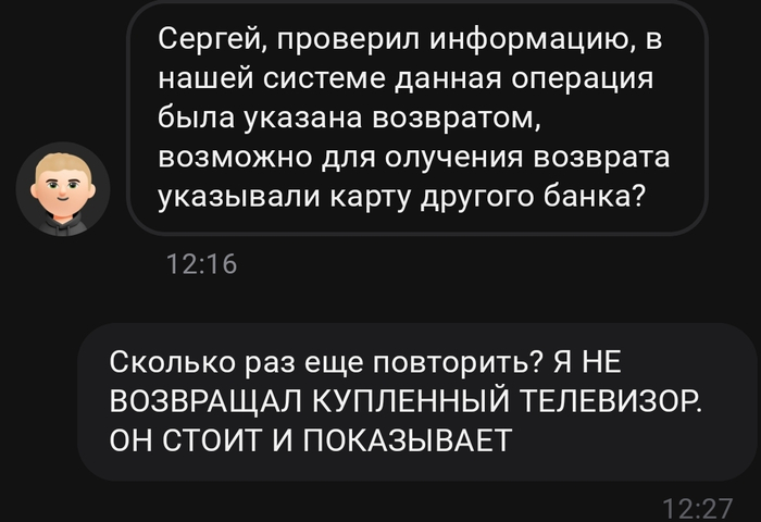 Важно запомнить: сотрудник не увидел возврата товара и составил обращение. Конечно не увидел, ведь телевизор дома стоит😁