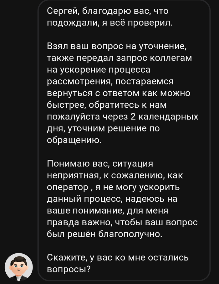 И тут оказывается, что те обращения были внутренними, а сейчас Сергей составил официальное обращение. Ух, аж страшно стало. Но, надо признать официальное решается быстрее - за 2 часа. Вот только ответ - просто отписка, что был возврат