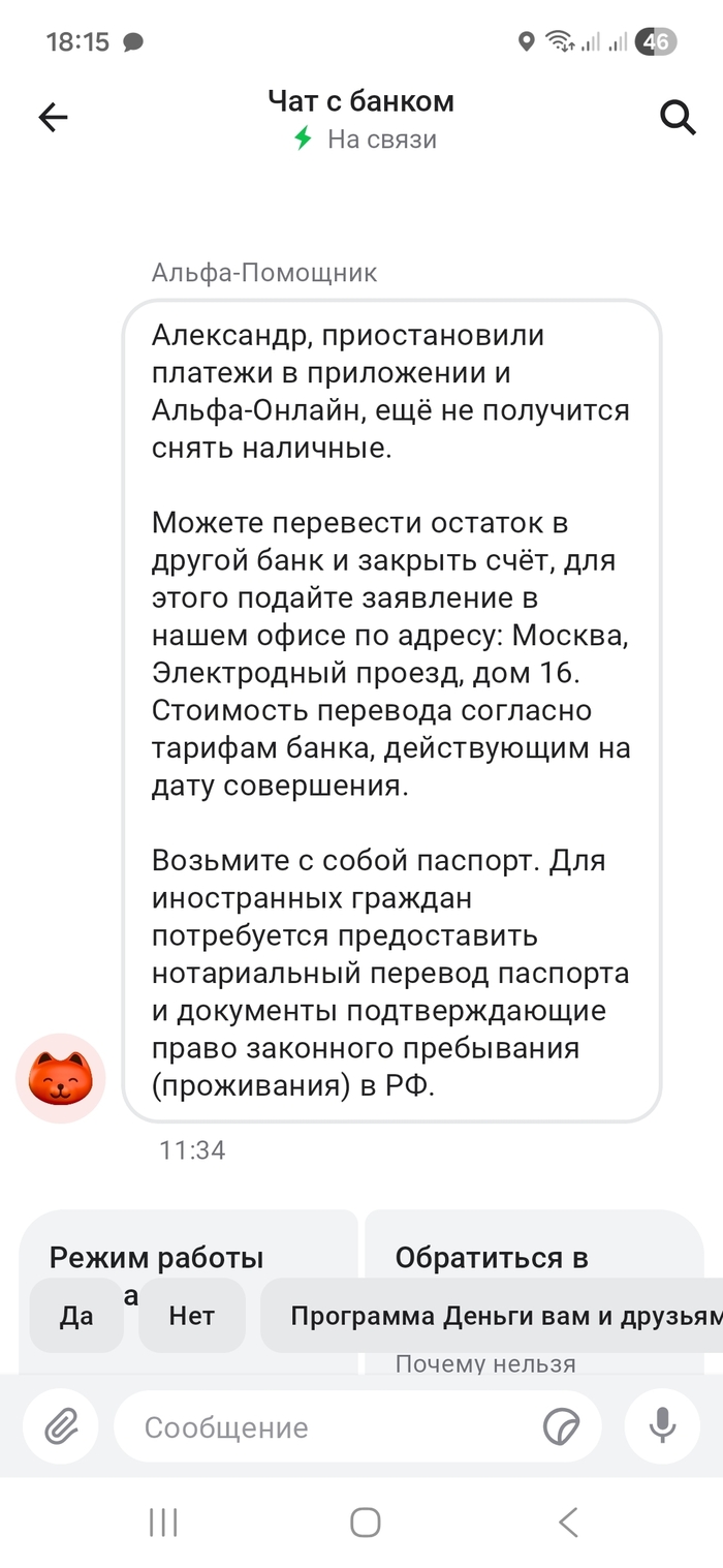 Ну чтожжжж начнём господа. 12.02.2026 продал дачу, сумма 3 000 000р. Деньги положил на счёт в Альфа-банке куда получаю заработную плату! Начал переводить деньги для возврата людям долгов коих накопилось не мало, так же помощь родственникам(для этих целей и была продана дача)Большую сумму в размере 450 000 р решил перевести по реквизитам, так что бы не было вопросов, Боже как же я ошибался!!!! И вот, прекрасным субботним вечером я получаю оповещение о том что мои счета заблокированы по 115 ФЗ. Сказать что я офигел ничего не сказать! И тут у меня за полторы недели значительно стала окрашиваться голова в белый цвет. Банк просит подтвердить все операции карл, ВСЕ!! Предоставить выписки с других карт, договор купли продажи, куда и с какой целью я переводил дробные суммы(например 5697р) и самое предоставить договоры-займов с контрагентами( это обычные люди мои друзья, коллеги, знакомые соответственно с которыми нет ни каких расписок и договоров ,что за бред). Предоставляю в чат банка ДКП, выписки с других банков, фотографии но где же я возьму те самые договора-займов?? а ни где, их просто нет, кто то может сказать да напиши да предоставь, отвечу, не буду подделывать НИ ЧЕ ГО!!! В итоге что мы имеем: банк отказывает и говорит, приходите закрывайте счёт, мы Вам переведём деньги в другой банк. Ну сказано,сделано. Да Да Да , конечно, а вот Х*Й вам!!!!! Данное действие возможно сделать только в головном офисе, угадайте и где же он может находиться???? Естественно г. Москва. А наша белокаменная вот нихуя не близко. КАК СУКА Я ТУДА ДОБЕРУСЬ, ЕСЛИ ДАЖЕ ЗАРПЛАТА И ОТПУСКНЫЕ ПРИШЛИ НА ВАШ ЗАБЛОКИРОВАННЫЙ СЧЁТ. Я вот сижу и просто охуеваю. СУКА хуй с Вами, я закрою счёт переведите мне деньги, но с хуёв я должен ехать в Москву???????. Есть бешенное желание подать на них в суд, за седые волосы, за время, за не удобство, сука за то что я опять занимаю что бы жить имея собственные средства, но блять походу Альфа-банку они нужнее. У меня всё господа, ни кому не советую быть их клиентами. Всем добра, берегите себя, своих близких и свои средства! Прошу поднимите в ТОП, что бы меньше людей обожглось!