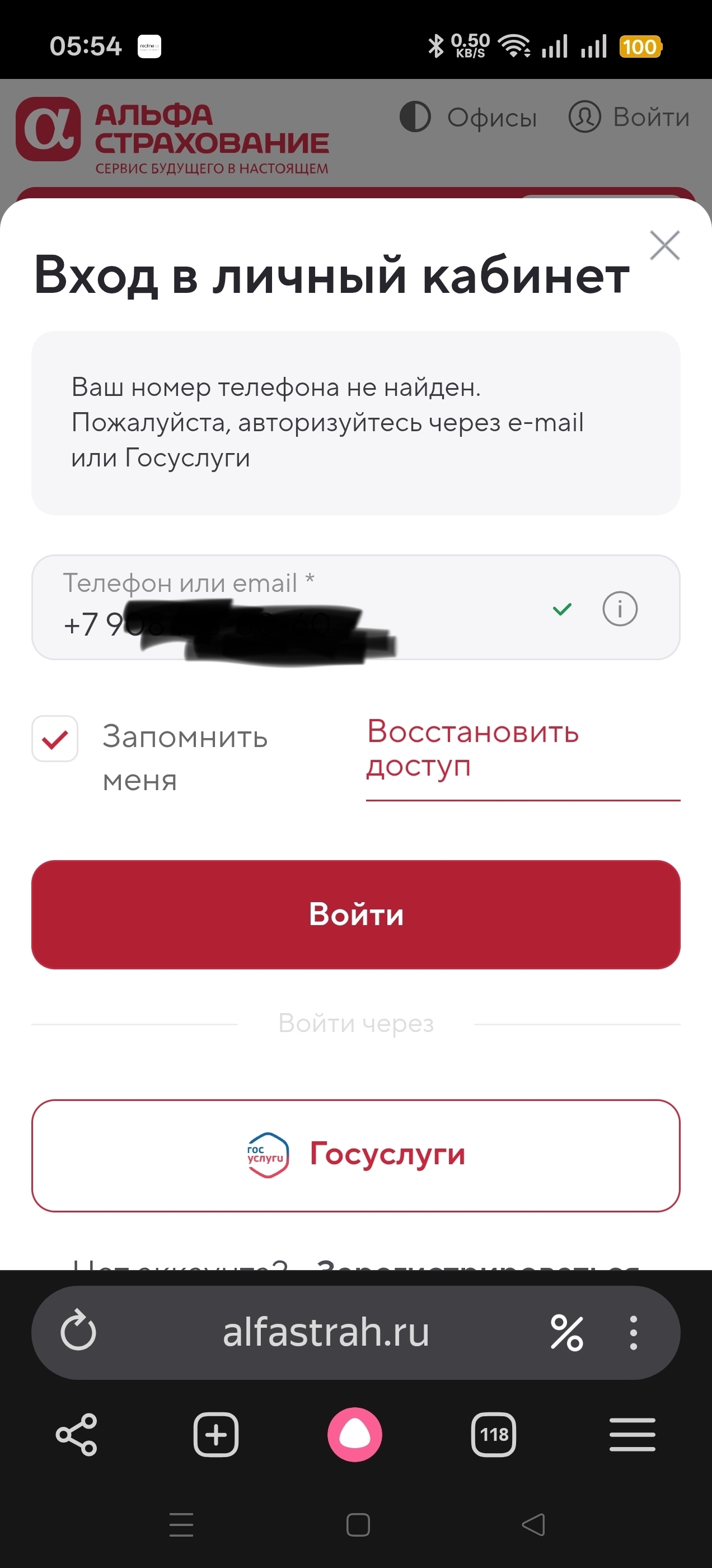 На сайте alfastrah.ru войти по номеру телефона, привязанному к карте, не выходит,- " нет такого номера".