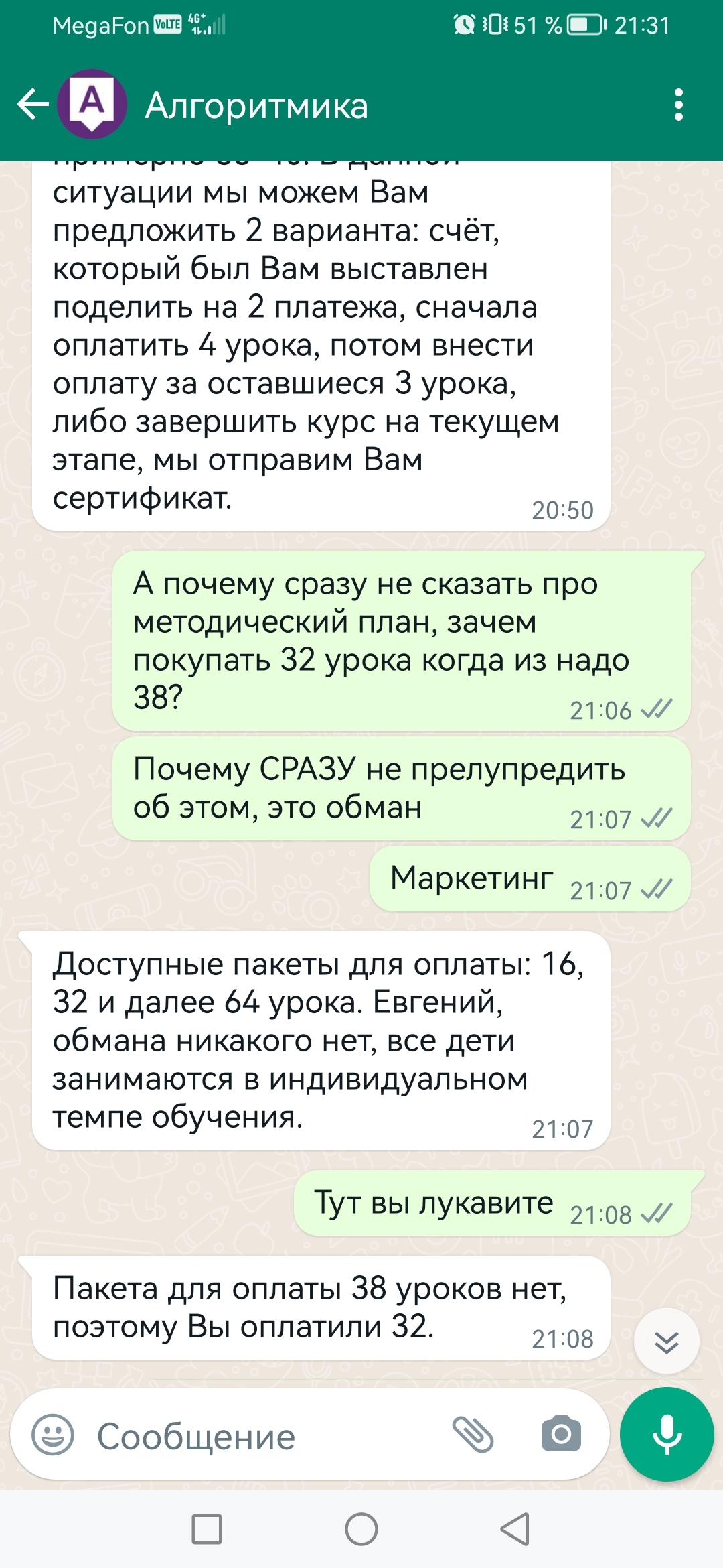 После 32-го урока (примерно, я не считал) администраторы мне обьявили, что оплата закончилась, а курс еще нет...и... попросили еще 7 тысяч рублей т. к. курс не полный, ребенок плохо усваивал прогромму и т. д. и т. п. (((