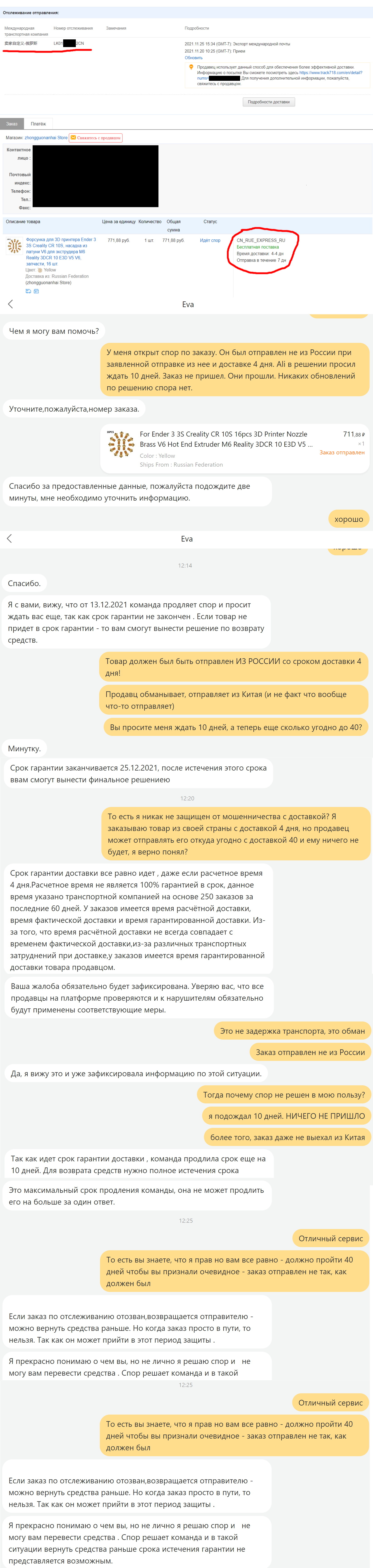 Заказ с доставкой из России (4 дня) продавец может отправить из Китая не предупреждая, вы будете ждать, деньги вернут только если заказ вообще не придет, а спор вы можете открыть через поддержку но там скажут ждать 40 дней.
