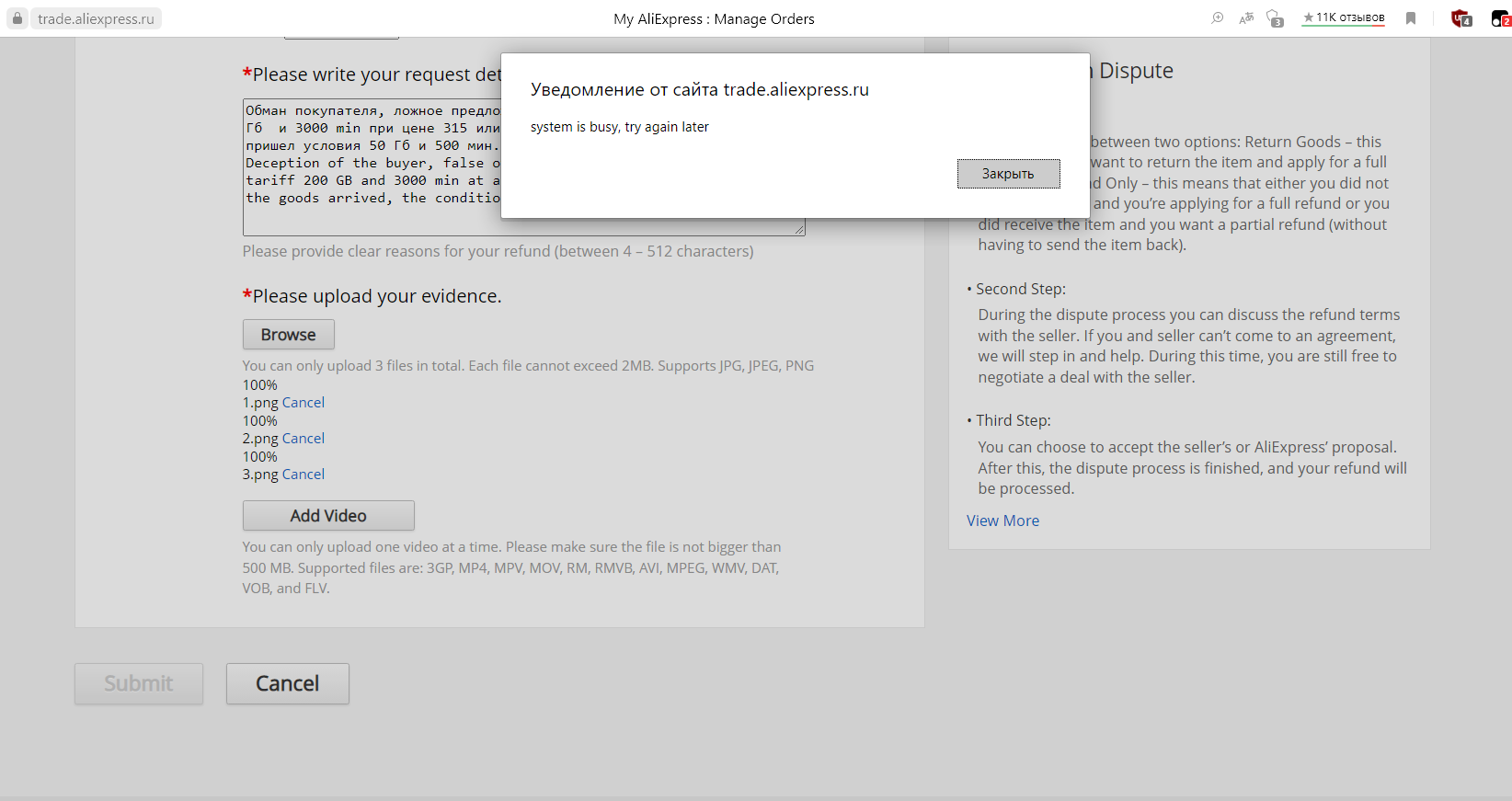 При попытке открытия спора с trade.aliexpress.ru либо с trade.aliexpress.com вылезает сообщение вверху "system is busy, try again later" (пробовал браузеры opera и yandex), в итоге открыл спор через одну из версий на 4pda через какие то дебри.