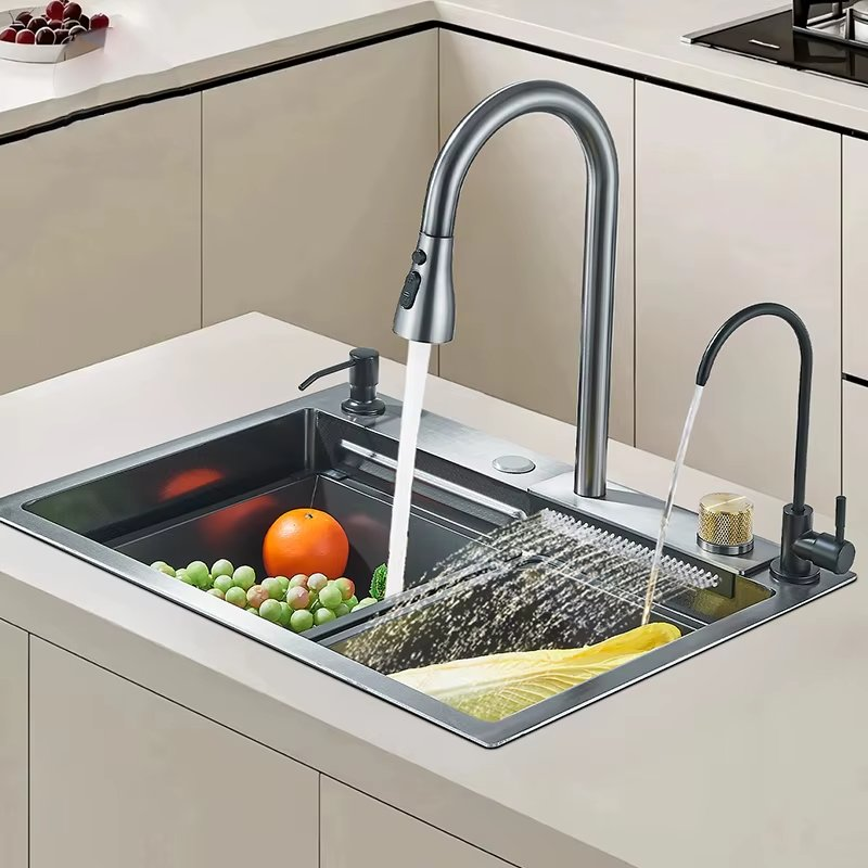 Эта раковина из нержавеющей стали дополнена встроенной лейкой и удобной системой подачи воды.