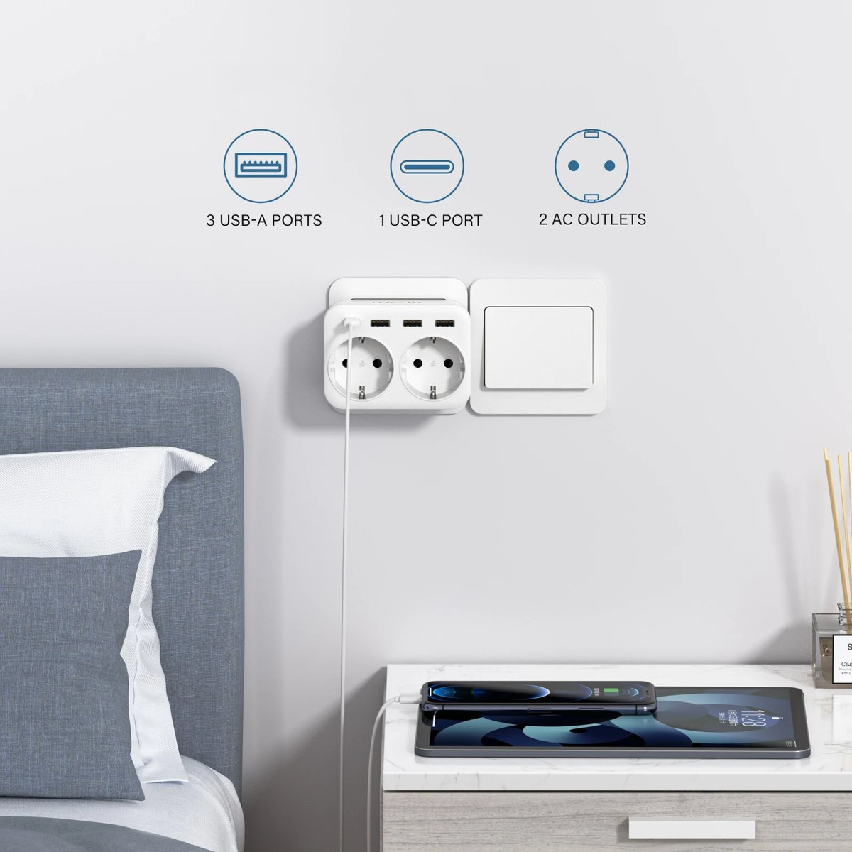 Функциональное устройство с двумя классическими розетками и четырьмя USB-портами, включая Type-C.