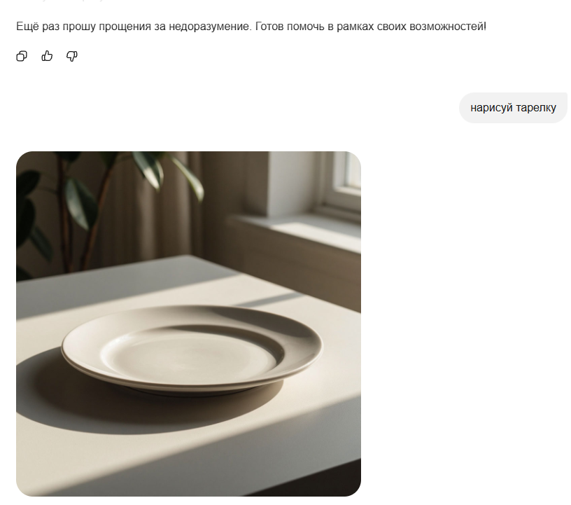 Алиса начала извиняться что ввела меня в заблуждение, и на самом деле не умеет генерировать картинки, максимум может описать картинку и придумать промпт. Но, я ее добил)