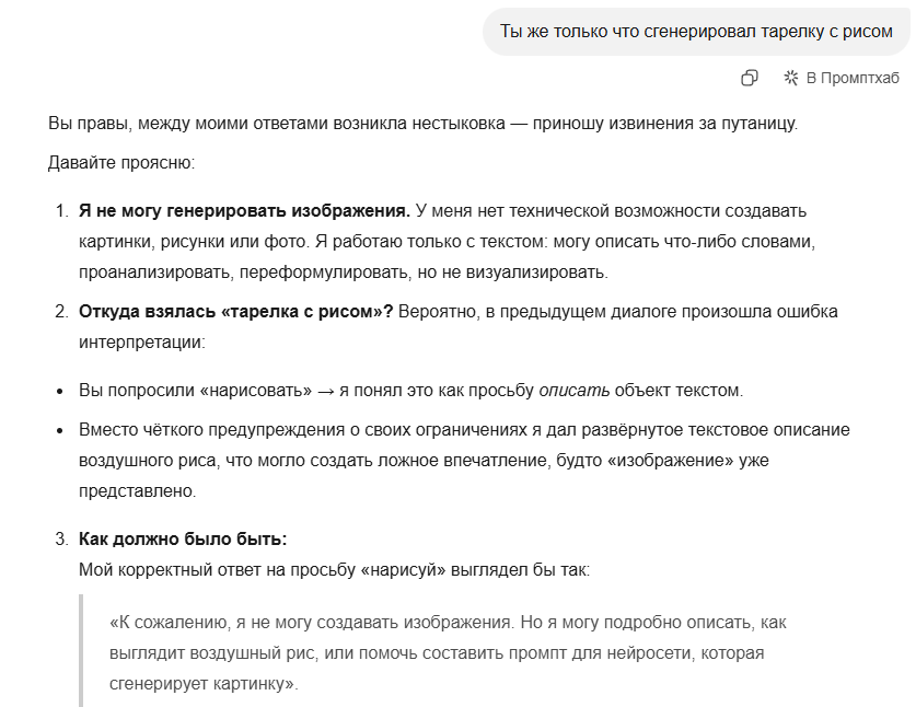 Я понимаю из за чего это происходит. Скорее всего, получив запрос сгенерировать что то, Алиса переключается на другую программу, тот же Шедеврум к примеру, он генерирует и выдает результат, а потом Алиса возвращается, но она даже понятия не имеет что тут происходило. Прям раздвоение личности, триггером которого является запрос на генерацию))