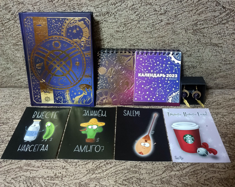 7. "Для того, чтобы быть вместе" - да! Я узнаю их из тысячи! Это открытки, дизайн для которых создавала моя Снегурочка. "Вместе навсегда" - мой фаворит во веки веков ))) И красивенный настольный календарь, её же дизайна, который сочетается с блокнотом, распакованным ранее. Унесу на работу, будет весь год напоминать мне об этом обмене подарками и радостными эмоциями.