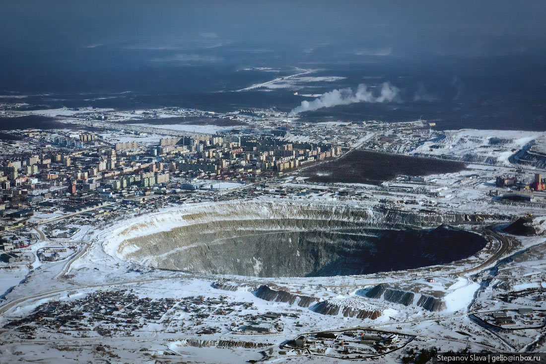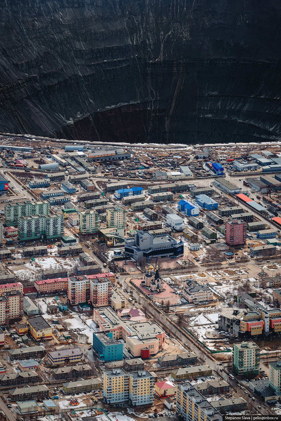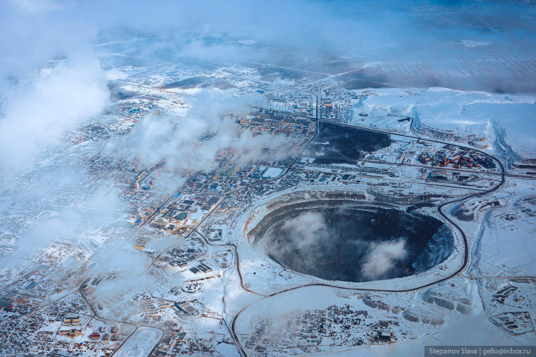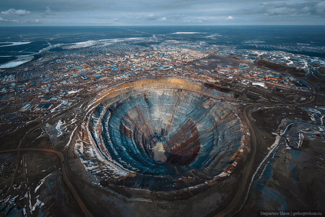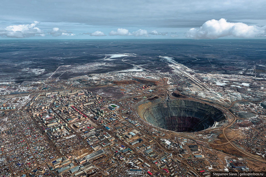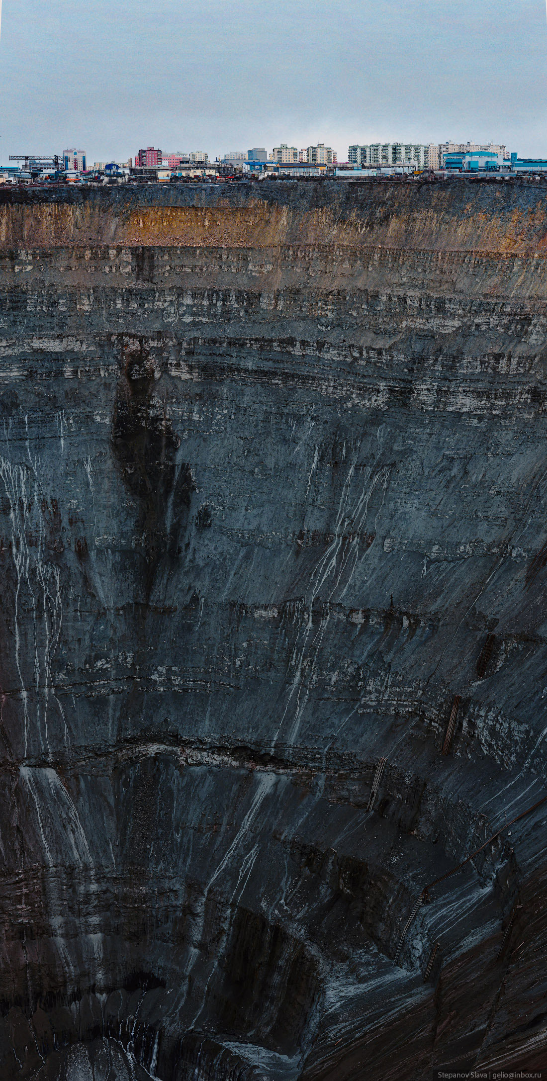 Карьер расположен в непосредственной близости от города. Добыча алмазов открытым способом велась в Мирном в течение многих десятилетий.