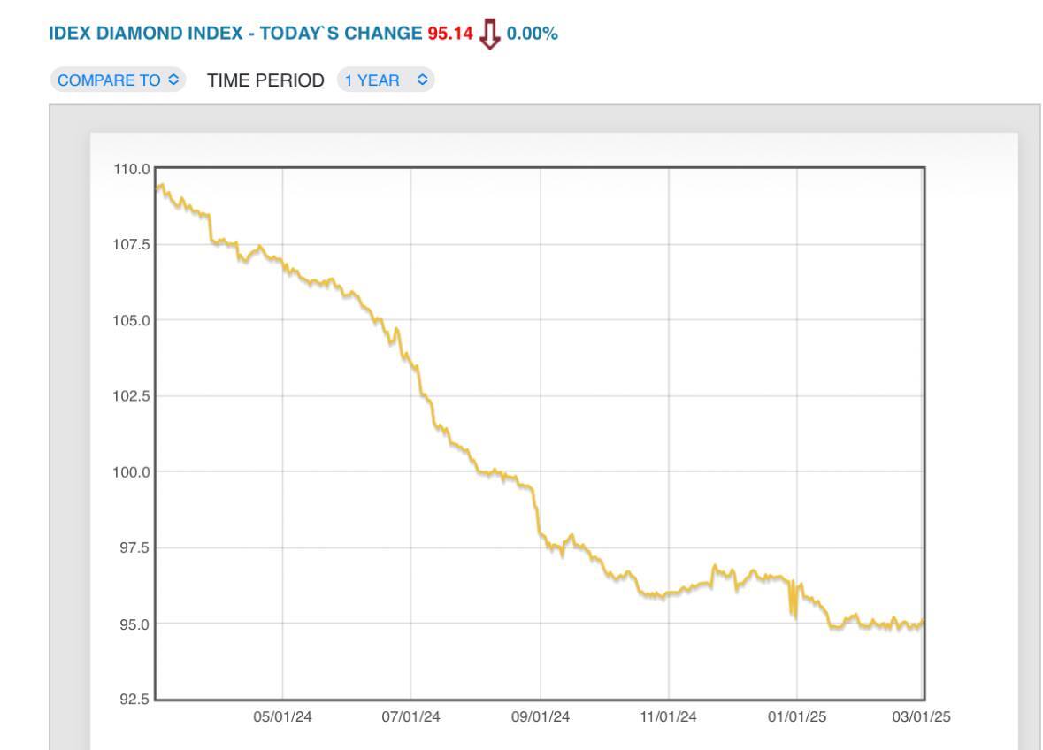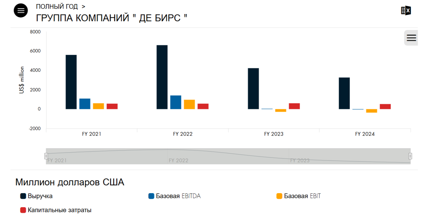 💎 Компания выполнила производственный план по итогам года — добыто 33 млн карат алмазов, но индекс цен на алмазы за год упал на 16% (с пиковых значений 2022 г. на 40%). С 1 января 2024 г. EC ввела ограничения на импорт непромышленных алмазов добытых в РФ, а США с 1 марта запретили импорт из России непромышленных алмазов весом от 1 карата, а с 1 сентября от 0,5 карата. В связи с проблемами в алмазной отрасли ещё в декабре 2023 г. Гохран договорился с Алросой о покупке алмазов, а уже в марте 2024 г. приобрёл первую партию алмазов, вторую приобрёл под конец года (сумма сделки не раскрывается, но есть лимит на покупку — 51,5₽ млрд за 2024 г., на 2025-27 гг. — 154,5₽ млрд).