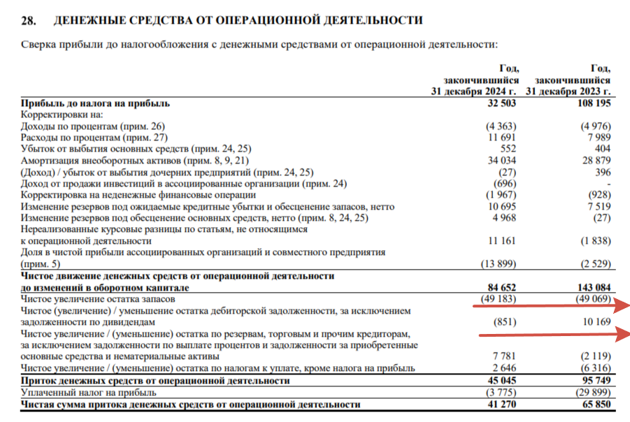 💎 OCF сократился до 41,3₽ млрд (-37,3% г/г) из-за увеличения запасов и задолженности по дебиторке во II п. CAPEX снизился до 58,9₽ млрд (-7,4% г/г), как итог FCF отрицательный -12,9₽ млрд (годом ранее +6,3₽ млрд). Исходя из див. политики компании, то дивидендов не должно быть, ранее заплатили 2,49₽ (50% FCF, 20₽ млрд) на акцию за I п., когда был рекордный FCF из-за распродажи запасов.