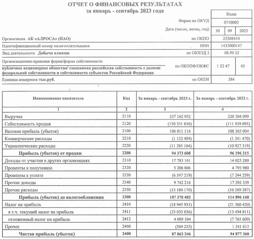 Алроса опубликовала финансовые результаты по РСБУ за 9 месяцев 2023 года (III квартал 2023 года). Если рассматривать отдельно результаты III квартала, то они получились впечатляющими. Во многом это было достигнуто за счёт крупной закупки со стороны Индии в августе она приобрела у России алмазы на рекордные за последние годы $215 млн, данная закупка произошла из-за временно запрета на покупку алмазов со стороны Индии (сентябрь, октябрь). Также компания заработала по статье доходы от участия в других организациях за III квартал — 16,4₽ млрд, тогда как за полгода 2023 было получено дивидендов всего на 1,3₽ млрд. Поэтому так важны финансовые результаты по МСФО, ибо отчёт по РСБУ не даёт полной картины (дочерние организации не учитываются, из-за этого может быть расхождение по фин. показателям). Что же насчёт общего результата компании за 9 месяцев, то они тоже вполне удачные, учитывая, с какими проблемами столкнулась компания, давайте рассмотрим основные показатели: