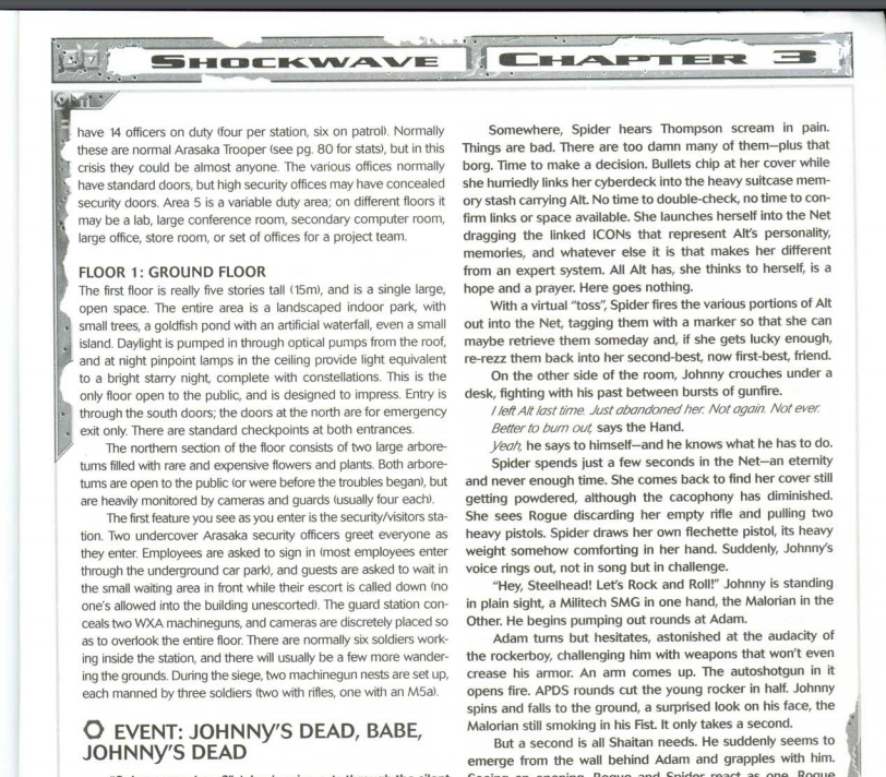 А там, где речь идет о высоких перспективных технологиях, всегда появляется Arasaka. Рано или поздно, но — всегда. И этот случай не стал исключением: после показанной в игре размолвки Джонни и Альт произошло нападение, в ходе которого последняя была похищена — и доставлена в самое сердце Arasaka Tower, где ей делают предложение по созданию программы «Душегуб 2.0».