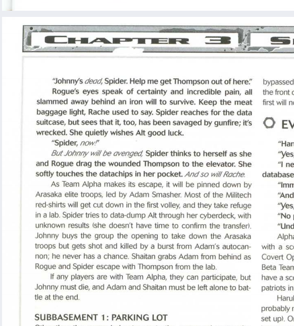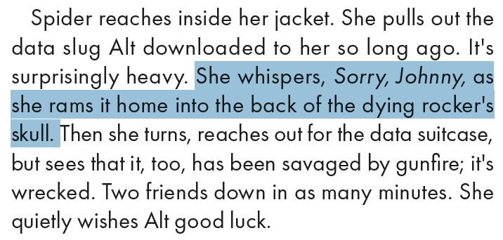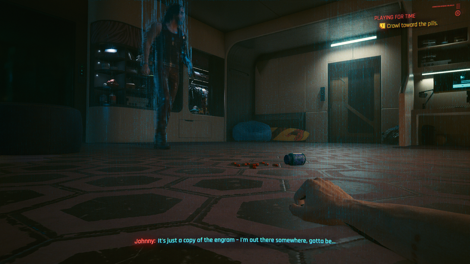 Примечание: в игровой версии событий никакого модема не было — Сильверхенд по незнанию самолично вырвал провод, подключавший Альт к Сети. Как мы помним из других квестов игры (к примеру, из задания по спасению Эвелин Паркер, где Джуди неоднократно делает упор на важность страховочных манипуляций), подобное действие в 99.9% случаев мгновенно убивает нетраннера. Исход ситуации по факту остался таким же, однако в этом случае к «смерти» Каннингем Джонни оказался причастен напрямую — а не косвенно, как было показано в первоисточнике.