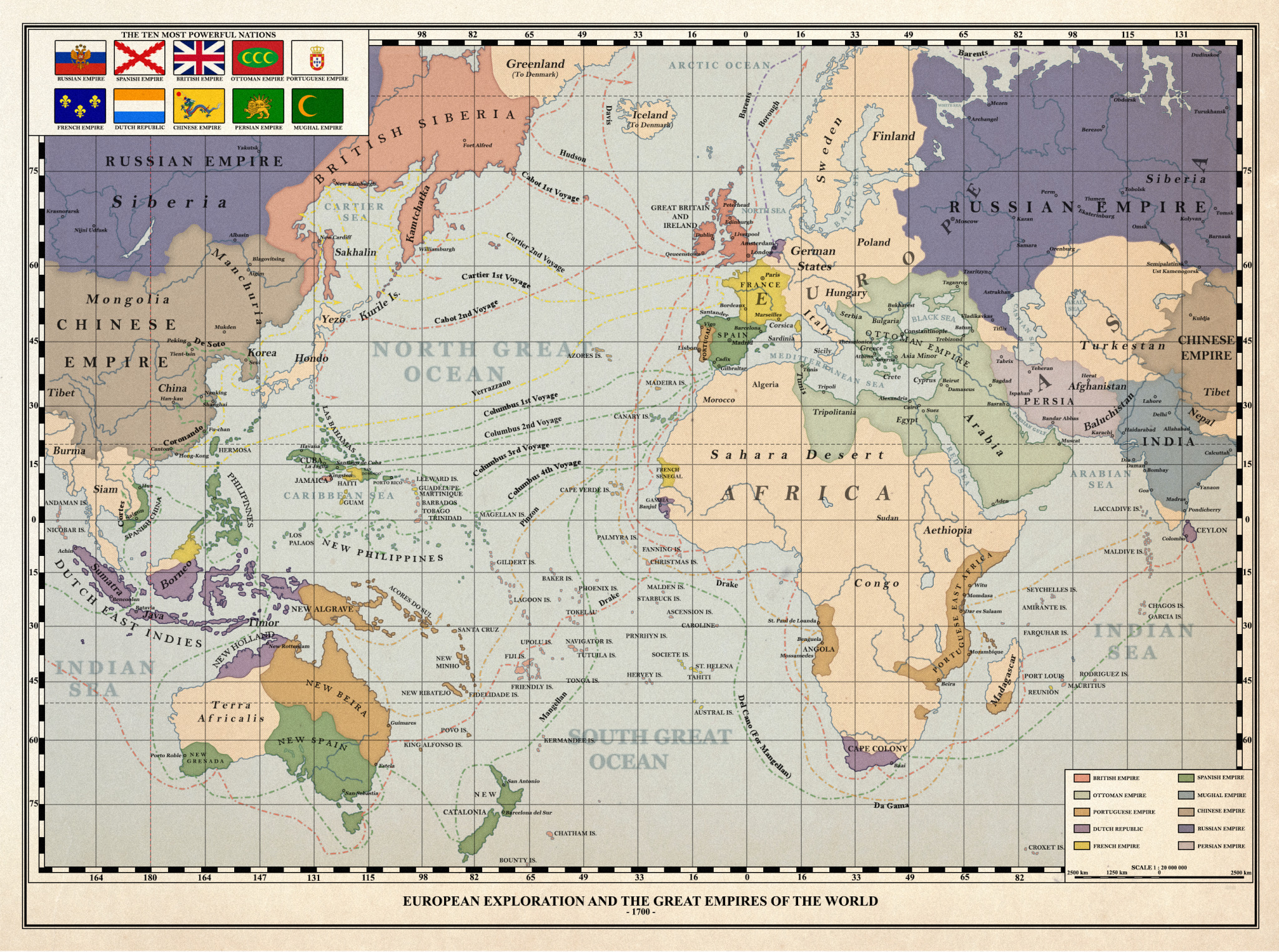Европа и Африка, включая Российскую и Оттоманскую империи, нарисованы в точности так, как они выглядели в 1700 году.