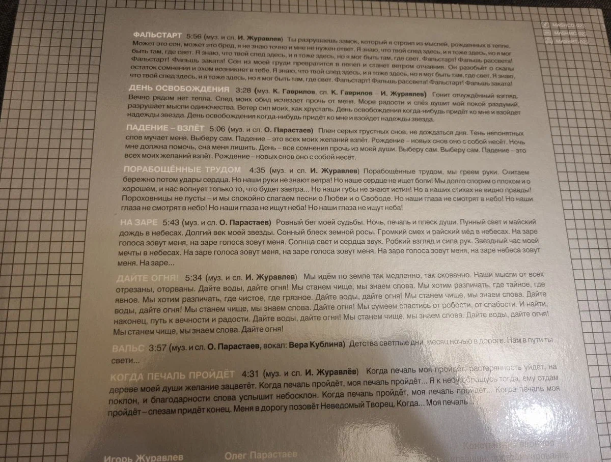 С оборотной стороны конверта можно увидеть список песен и даже их тексты (мало ли, кто-нибудь захочет попеть вместе с этой замечательной группой). Внутри есть вкладыш, на котором можно прочитать ценную информацию во время прослушивания этой замечательной пластинки.