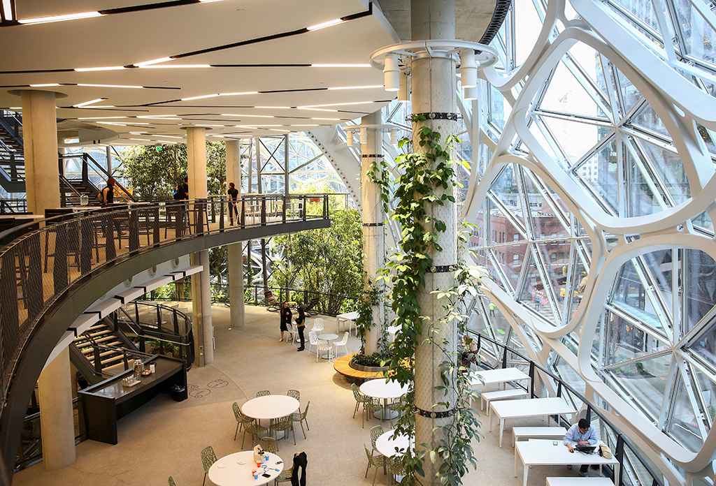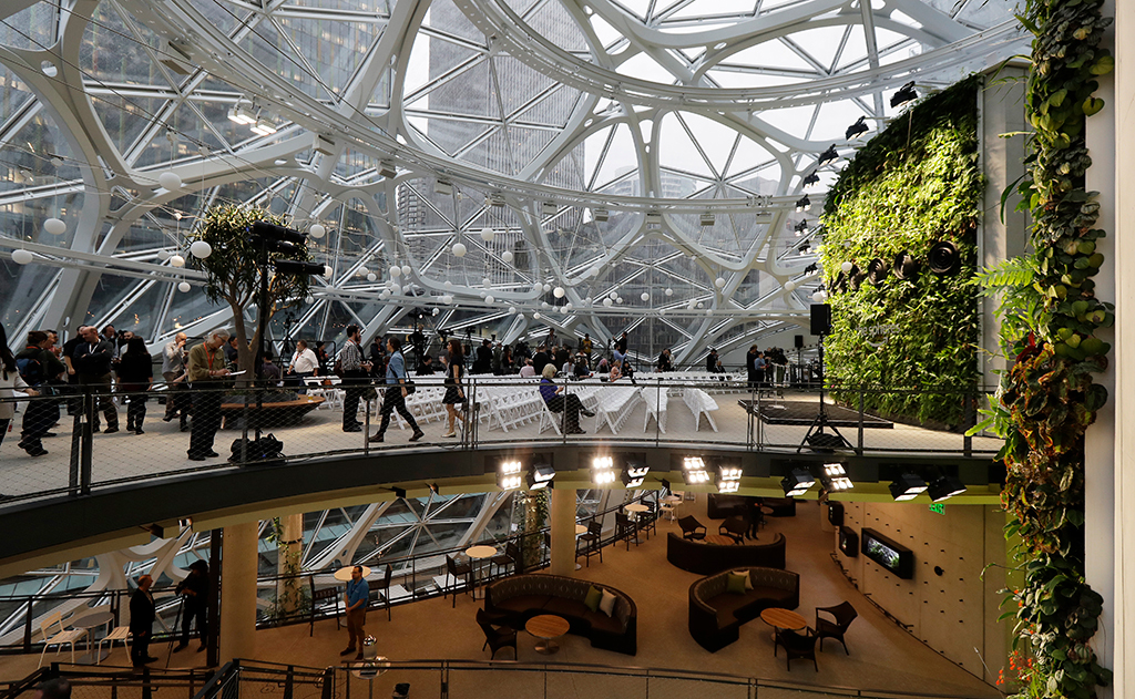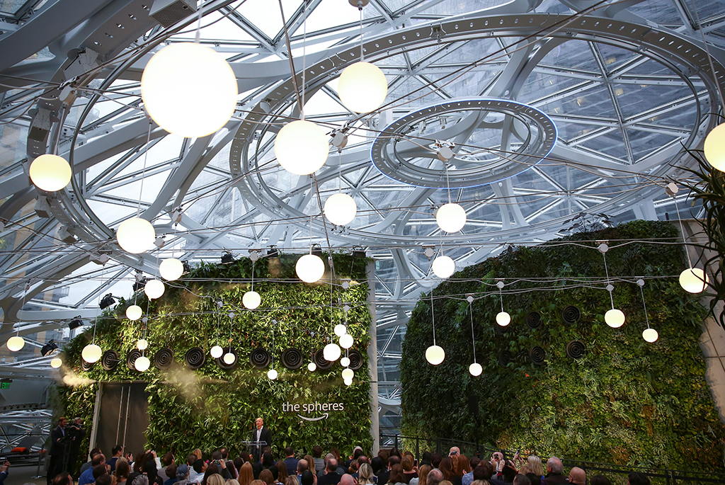 Компания Amazon открыла в центре Сиэтла оранжерею — мини-ботанический сад The Spheres («Сферы»). Постройка действительно выглядит как три сферы из стекла и металла. Внутри в искусственно поддерживаемом тропическом микроклимате растет 40 тысяч растений из 30 стран. Главная «фишка» оранжереи — вертикальные сады: 25 тысяч растений, растущие на почти 400 кв.м. вертикальных ячеистых стенок.