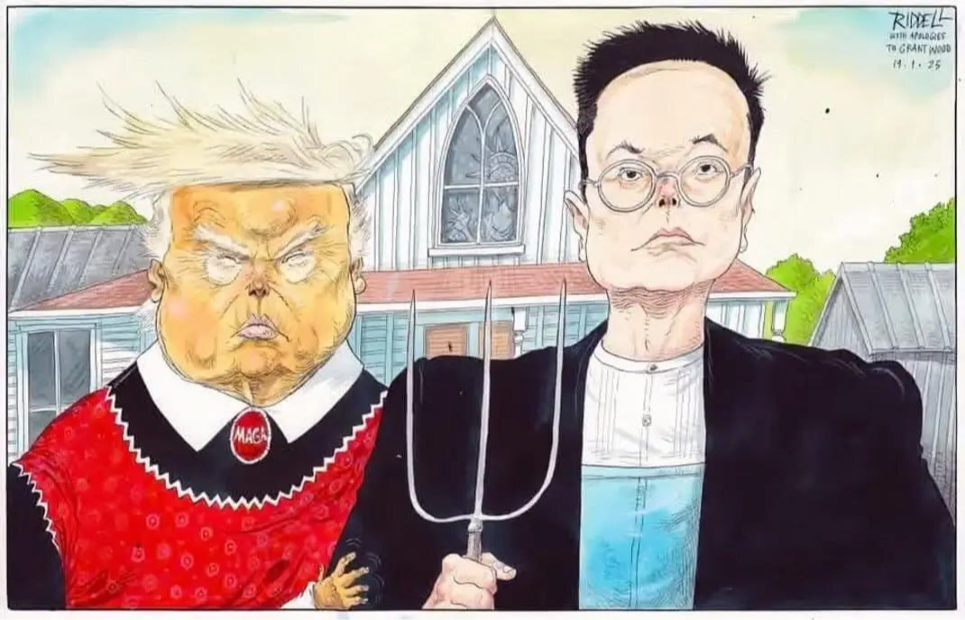 8 archiguk Политические мемы Серия M E M E L O S A U R U S "Американская готика" Гранта Вуда 8 месяцев назад Телеграм канал - t.me/memelosaurus Telegram (ссылка) Юмор Мемы Странный юмор Дональд Трамп Илон Маск Грант Вуд Американская готика Политика Карикатура 3 Ещё 0