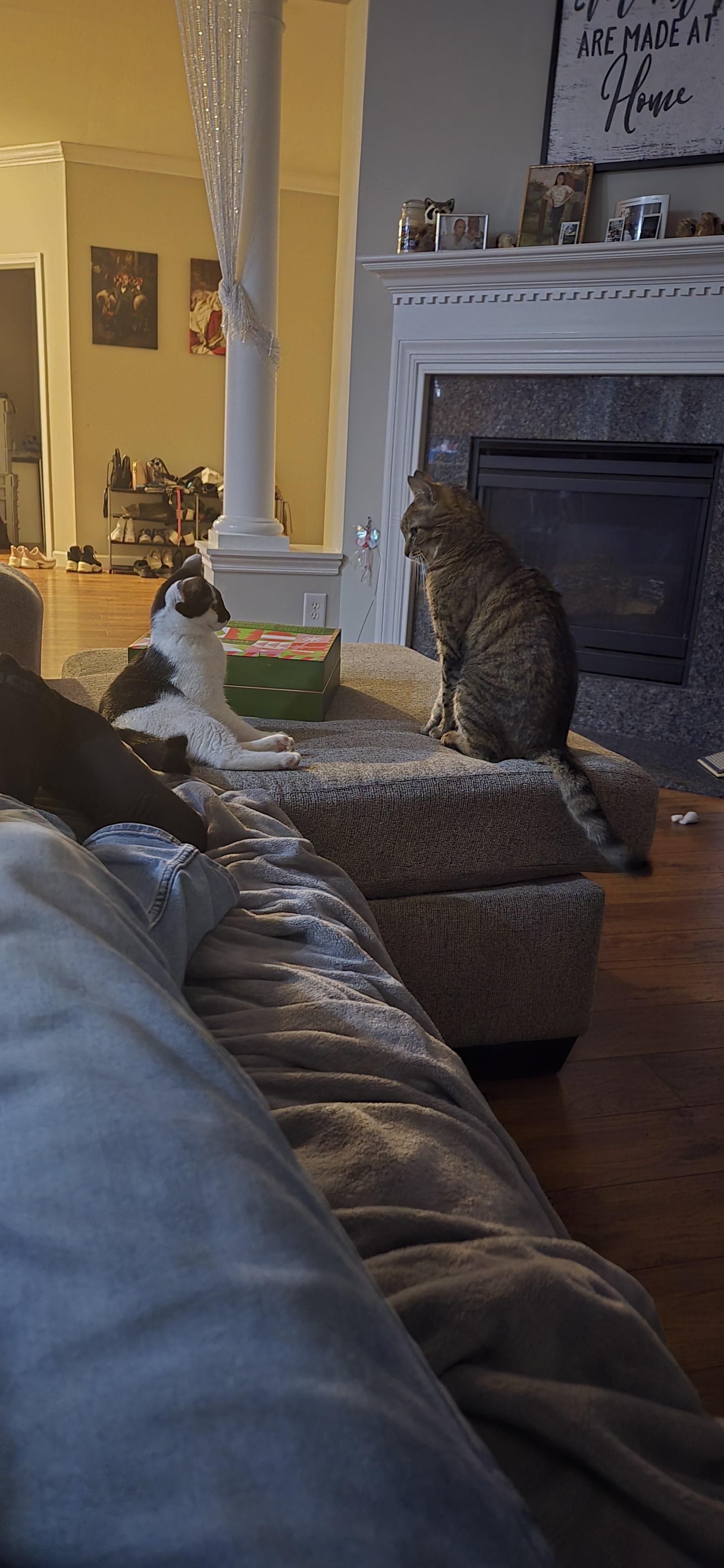 Следующий пассажир: Мисти. Жена увидела объявление, что отдают кошечку. Ей понравилась, и решили забрать. Люди нашли котёнка в лесу — больного, полуслепого и облезлого. Отвезли в шелтер, кошечку вылечили, и они стали её фостерами и забрали домой. Один глаз до конца не смогли вылечить, и он плохо видит. Для кошки это как пятно в центре, жизни ей вообще это не мешает. Приехали, забрали себе. Думали, взяли кошечку, оказалось, что енота. Ну или еноты её воспитывали. С первой минуты без тени стеснения дом был изучен и признан собственностью, никакой осторожности или пряток под кроватью. Казалось, что у неё внутри живёт два кота и енот. Всё, что не прикручено, становилось игрушками и моталось по полу, туалетная бумага раскручена и разодрана. Везде, куда можно залезть, всё обследовано. Проблема решилась быстро покупкой кошачьих игрушек и когтеточек в больших количествах. Плюс с возрастом стала спокойней. Постоянно хотела сбежать на улицу: было интересно, что там. Как-то раз неплотно закрыл дверь на задний двор, и кошка сбежала. Причём остальные коты при открытой на ночь двери сходили, погуляли и вернулись туда, где еда, вода и тепло. А дело было зимой, было где-то −2 градуса на улице. А Мисти пропала. Жена в это время была в России. Я искал её весь день. Расклеил объявления. Дал объявления в интернете. Часов в 11 вечера вышел очередной раз искать. И услышал кошачий ор где-то неподалёку. Пошёл на звук. Эта балбеска с перепугу, что ли, залезла на дерево рядом с домом и молчала весь день. К вечеру замёрзла и стала голосить. Наверх залезть смогла, а вниз не соображает как. Сидит, орёт. Я принёс лестницу, так как нижние ветки далеко. Залез до куда смог. Но дальше веток нет, а она сидит сверху. Высота выше второго этажа. Пришлось включать соображалку. Взял в гараже щётку для пола, примотал к коробке из-под апельсинов. И полез обратно на дерево. А надо понимать, что я вообще-то высоты боюсь. В итоге сидел 40 минут, вытянув палку с коробкой, чтобы дурёха спрыгнула в коробку. В итоге дождался. Запихнул её под куртку и, придерживая одной рукой, с одной рукой слез вниз. Как я всё это сделал, сам не пойму, учитывая, что высоты боюсь и по деревьям лазил в 5 лет последний раз. Как-то так. Кошка вообще супер общительная, добрая, ласковая. Первые два месяца ела как мамонт. Набрала жирок и успокоилась. Хотя к еде всё равно бросается как метеор. Сам принцип — примчаться голопом с криками и мяуканьем. Никакой степенности и грации :).
